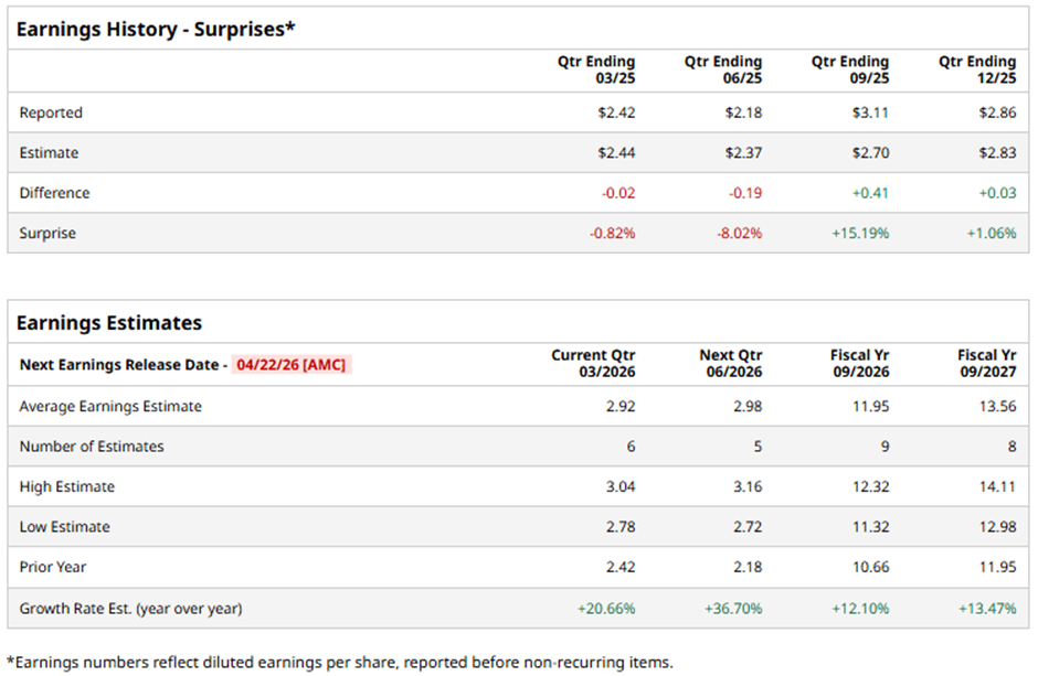 The Saint Petersburg, Florida-based company is set to announce its fiscal Q2 2026 results after the market closes on Wednesday, Apr. 22. Ahead of this event, analysts forecast RJF to report an adjusted EPS of $2.92, an increase of 20.7% from $2.42 in the year-ago quarter. It has exceeded Wall Street's earnings estimates in two of the last four quarters while missing on two other occasions.