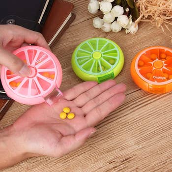 Promising review: "I love these pill organizers! Makes morning medication taking so much easier. Seven slots for the week with a push button in the middle to rotate to the slot! Very compact. Not a lot of space for a bunch of pulls. Perfect for those who only take two or three medications at a time. Love this for my child who has a medication routine. Allows him to access and do it on his own with the easy-to-use design!" —Mallory