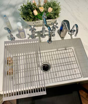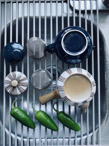 Promising review: "This is very sturdy and it allows air into cups, pans, etc. to dry easily — unlike a drying pad. It holds heavy pans with no problem. The color is soft and goes great with my white and gray countertops, and it's extremely functional. It's easy to clean, just roll it up and store it under the sink. Highly recommend. 👍🏻" —Denise