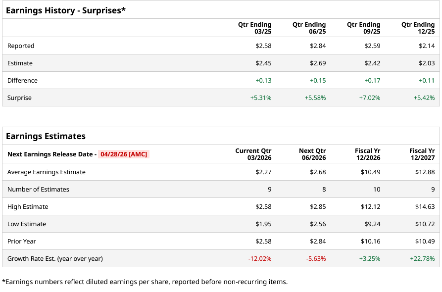 Bellevue, Washington-based T-Mobile US, Inc. (TMUS) provides wireless communications services in the United States and internationally and operates as a subsidiary of Deutsche Telekom AG. The company has a market cap of $231.4 billion and offers voice, messaging, and data services to postpaid, prepaid, wholesale and other services customers. TMUS is expected to release its Q1 2026 earnings on Tuesday, April 28, after the market closes. Ahead of the event, analysts expect the company’s EPS to be $2.27 on a diluted basis, down by 12% from $2.58 in the year-ago quarter. The company has exceeded Wall Street’s EPS estimates in each of its last four quarters. Stock Index Futures Rally on Prospect of End to Middle East Conflict, U.S. Economic Data and Fed Speak in Focus Ignore the Panic and Buy the Dip in Micron Stock, Says Bank of America Stocks Climb on Hopes for an End to Iran War Markets move fast. Keep up by reading our FREE midday Barchart Brief newsletter for exclusive charts, analysis, and headlines. For fiscal 2026, analysts project the company’s earnings per share to be $10.49, up 3.3% from $10.16 in fiscal 2025. Moreover, its EPS is expected to rise 22.8% year over year (YoY) to $12.88 in fiscal 2027. TMUS stock has declined 20.7% over the past 52 weeks, underperforming the S&P 500 Index’s ($SPX) 17% rise and the State Street Communication Services Select Sector SPDR ETF’s (XLC) 15.8% rise during the same time frame. On Feb. 11, TMUS stock grew 5.1% following the release of its strong Q4 2025 earnings. The company’s revenue grew 11.3% from the prior year’s quarter to $24.3 billion and surpassed the Street’s estimates. TMUS’ adjusted EPS for the quarter fell nearly 27% from its year-ago value to $1.88, due to a severance-related loss, and still managed to stay on top of Wall Street estimates. Analysts are moderately bullish on TMUS, with the stock having a “Moderate Buy” rating overall. Among the 30 analysts covering the stock, 17 are recommending a “Strong Buy,” three suggest a “Moderate Buy,” and 10 suggest a “Hold.” TMUS’ average analyst price target of $267.54 indicates an upside of 27.4% from current price levels. On the date of publication, Aritra Gangopadhyay did not have (either directly or indirectly) positions in any of the securities mentioned in this article. All information and data in this article is solely for informational purposes. This article was originally published on Barchart.com