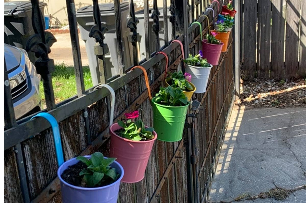 Promising review: "Lovely colorful flower pots. Perfect size to hold a single flower, and they add such a nice pop of color to my yard. Very easy to hang up, no hardware required! I’m getting a lot of compliments on them. I bought several sets and planted bright flowers in them. I have them lining the inside of my yard and on the front of the house. They add a lot a cheer and homeyness for a simple and cheap project." —Maegan