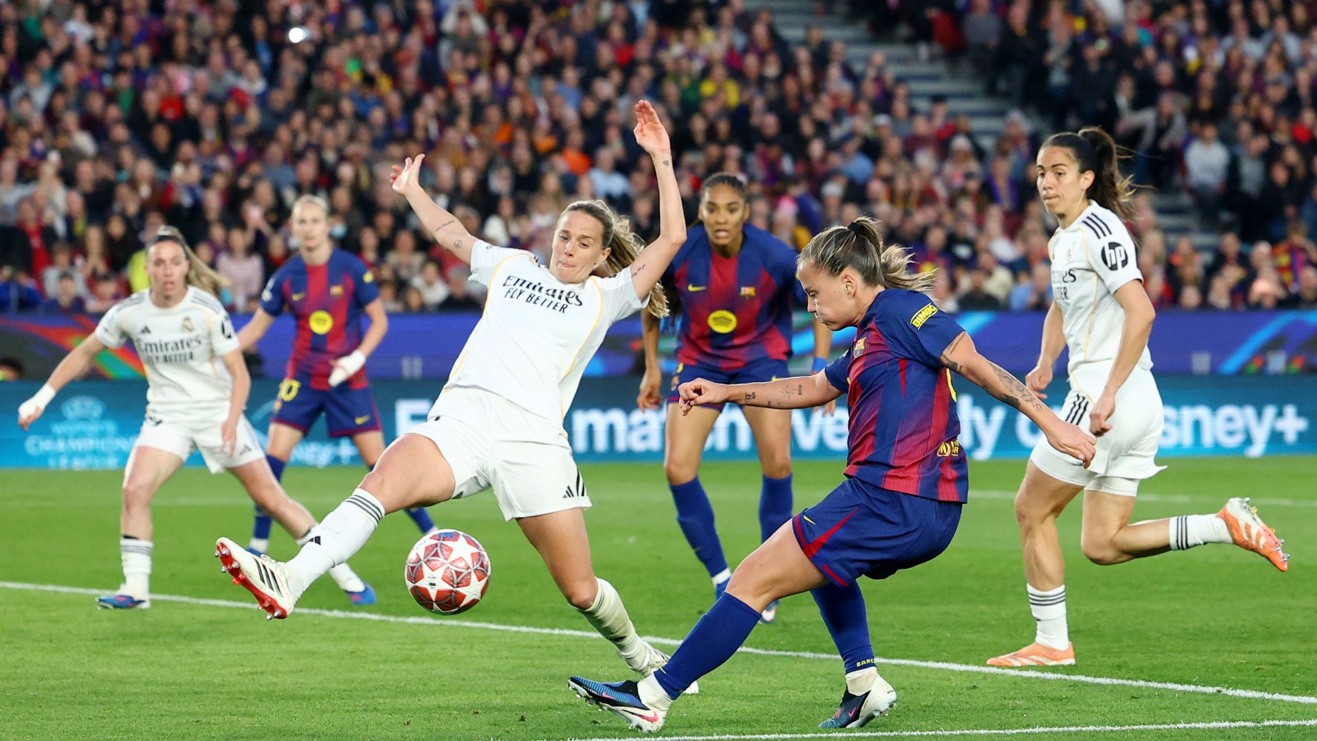 Irene Paredes headed home from a corner for Barca’s third, just as she had done in the first leg, as Madrid crumbled.