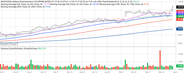 Sphere Entertainment (SPHR) is trading at a new all-time high and has strong technical momentum. Shares are up nearly 280% over the past 52 weeks. SPHR maintains a 100% “Buy” technical opinion from Barchart. Despite bullish technicals and analyst sentiment, elevated short interest warrants close monitoring. Valued at $4.25 billion, Sphere Entertainment (SPHR) is a premier live entertainment and media company. The company includes Sphere, a next-generation entertainment medium. I found today’s Chart of the Day by using Barchart’s powerful screening functions to sort for stocks with the highest technical buy signals; superior current momentum in both strength and direction; and a Trend Seeker “buy” signal. I then used Barchart’s Flipcharts feature to review the charts for consistent price appreciation. SPHR checks those boxes. Since the Trend Seeker issued a new “buy” on March 31, SPHR stock is up 8.36%. Stocks Pare Losses on Hormuz Report Stocks Recover on Hopes Strait of Hormuz Could Soon Reopen Dear Tesla Stock Fans, Mark Your Calendars for April 3 Tired of missing midday reversals? The FREE Barchart Brief newsletter keeps you in the know. Sign up now! Editor’s Note: The technical indicators below are updated live during the session every 20 minutes and can therefore change each day as the market fluctuates. The indicator numbers shown below therefore may not match what you see live on the Barchart.com website when you read this report. These technical indicators form the Barchart Opinion on a particular stock. Sphere scored a 5-year high of $127.41 on April 2. Sphere has a Weighted Alpha of +345.63. SPHR has a 100% “Buy” opinion from Barchart. The stock has gained 279.99% over the past 52 weeks. Sphere has its Trend Seeker “Buy” signal intact. The stock recently traded at $127.22 with a 50-day moving average of $107.99. SPHR has made 6 new highs and gained 11.21% over the past month. Relative Strength Index (RSI) is at 65.84. There’s a technical support level around $119.79. $4.25 billion market capitalization. Revenue is expected to grow 10.32% this year and another 1.84% next year. Earnings are estimated to decrease by 182.96% this year but increase again by 14.54% next year. The Wall Street analysts followed by Barchart gave the stock 9 “Strong Buy,” 1 “Moderate Buy” and 3 “Hold” opinions with price targets between $110 and $150. Value Line gives the stock its “Above Average” rating. CFRA’s MarketScope rates the stock a “Hold.” Morningstar thinks the stock is 10% overvalued. Only 1 investor following the stock on Motley Fool thinks it will beat the market. 9,750 investors are following the stock on Seeking Alpha, which rates it a “Strong Buy.” Short interest is high at 19.84% of the float with 7.46 days to cover the float. Analysts do not have great earnings projections for this year. The short Interest is very high at 19.84%. This bothers me. Monitor the short interest and see where it goes before making your decision. Additional disclosure: The Barchart Chart of the Day highlights stocks that are experiencing exceptional current price appreciation. They are not intended to be buy recommendations as these stocks are extremely volatile and speculative. Should you decide to add one of these stocks to your investment portfolio it is highly suggested you follow a predetermined diversification and moving stop loss discipline that is consistent with your personal investment risk tolerance. On the date of publication, Jim Van Meerten did not have (either directly or indirectly) positions in any of the securities mentioned in this article. All information and data in this article is solely for informational purposes. This article was originally published on Barchart.com
