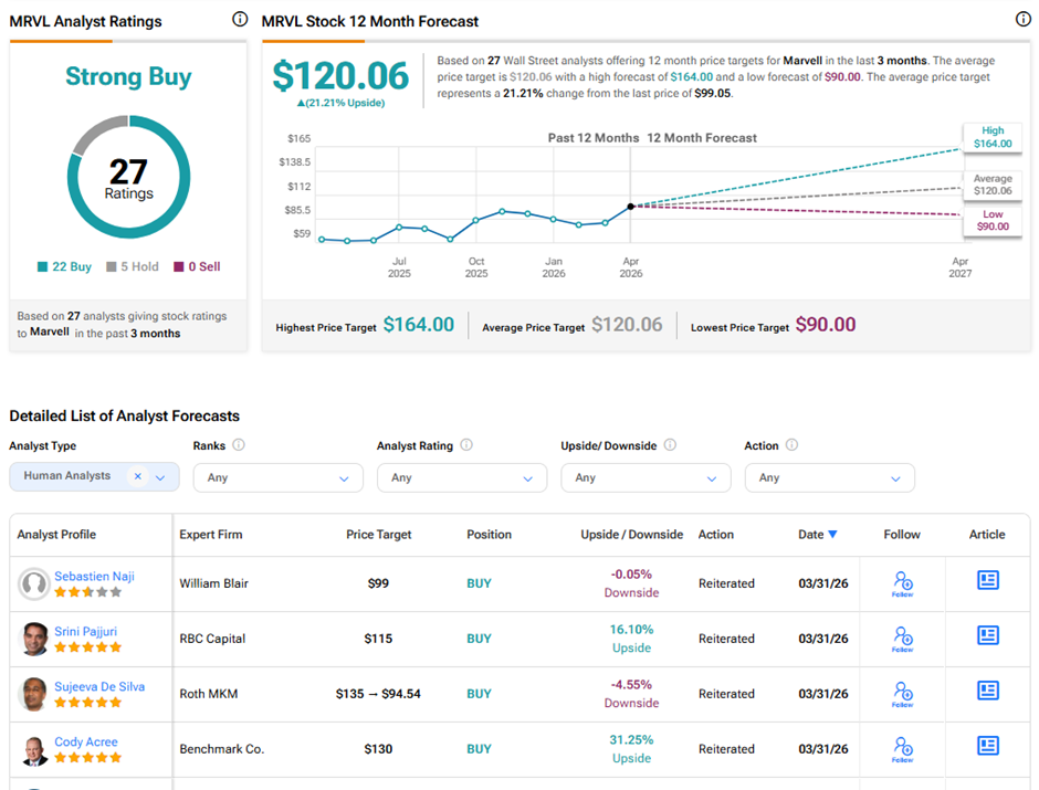 On TipRanks, MRVL has a Strong Buy consensus rating based on 22 Buys and five Hold ratings. The average Marvell Technology price target of $120.06 implies 21.2% upside potential from current levels. Over the past year, MRVL stock has rocketed 58%.