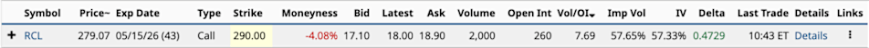 The CBOE Volatility Index, or VIX for short, jumped up to 27.89 early in Thursday trading, as traders fretted about the future price of oil after President Trump’s address to the nation Wednesday evening did little to calm the nerves of investors. Fortunately, the major indices recovered a decent amount of their losses by midday, as news reports suggested that Iran is working with Oman to develop a protocol to monitor traffic through the Strait of Hormuz. In addition, the economic data released on the day before Good Friday was better than expected. Nvidia Still Looks Cheap - Shorting Out-of-the-Money NVDA Put Options Is Attractive 1 Low-Risk, High-Reward Way to ‘Just Do It’ and Trade Nike Stock with Options Markets move fast. Keep up by reading our FREE midday Barchart Brief newsletter for exclusive charts, analysis, and headlines. Stocks continue to struggle to find direction. One company closely following rising oil prices is Royal Caribbean (RCL), the world’s largest cruise operator by market cap. While it hedges a significant amount of its fuel costs, rising oil prices will add significantly to its operating expenses. However, as companies go, Royal Caribbean is a well-managed organization that will be able to navigate (no pun intended) the near-term economic uncertainty. In Thursday’s options trading, the cruise operator had one unusually active option. The May 15 $290 call sets up nicely for a Long Strangle. Here’s why. Have an excellent weekend. As I mentioned in the introduction, it had one unusually active option in the final trading day of a shortened holiday week. It’s shown above. Truthfully, it had two. However, the second expired on Thursday; I don’t include options expiring within seven days. The call in question had a volume of 2,000, 7.69 times the open interest. That’s about 12% of its 30-day average of 16,584. RCL doesn’t generate massive options volume. However, the volume has picked up. In January, there were just four days with a volume of 10,000 or more. In March, there were 12, with seven over 20,000. The highest day in the first three months of 2026 was March 4 at 52,772, a couple of days after the start of the Iran war. The average put/call volume ratio in the past five days of trading is 3.41, a very bearish indicator. The average in the first five days of January was 0.61, a very bullish one. From the stock’s 2026 high of $356.39, its shares have lost 22% of their value. Volatility is up, and the trend is down; the Barchart Technical Opinion is a 56% Sell rating. The long strangle thrives on increased volatility. The long strangle strategy expects the share price to move significantly higher or lower due to increased volatility. It involves buying a call option (in this case, the $290 strike) and a put option at a lower strike price. Here are the potential put options based on Thursday's trading. At first glance, you might think the $270 put is the optimal choice for two reasons: 1) The chance of making money on the long strangle is 40.3%, and 2) The maximum loss probability is 13.8% -- the net debit of $37.60, or the cost of both options -- the lowest of the six put options. However, I like the idea of balancing the cost outlay with the probability of profit. With that in mind, you might consider the $250 put, where the net debit is $31.40, 16.4% less than the $270 put, while the profit probability is only 4.2 percentage points less. As you can see from the profit/loss graph above, the net debit of $31.40 is 11.29% of the share price. That’s a little above my 10% target, but not greatly so. Now, the maximum profit is unlimited, as the share price can go to infinity or go to zero. For example, if President Trump says tomorrow that the Iranians are opening the Strait of Hormuz, oil prices will fall, and RCL stock will rise, given its reliance on fuel (6.4% of 2025 revenue) for its business. So, the breakeven is $321.40 [$290 call + $31.40 net debit] on the upside and $218.60 [$250 put - $31.40 net debit] on the downside. In the past year, RCL stock has traded above the upside breakeven on three occasions: July 2025, August 2025, and February 2026, and below the downside breakeven once in April 2025. The expected move of $38.68 in either direction is not expected to take the price outside the upside or downside breakeven by May 15. That said, a positive announcement in the Middle East would likely push the stock well above the $38.68 estimate. In contrast, the equivalent downside move would likely only occur if it became evident that the Strait of Hormuz wouldn’t clear for many months or even years. In early March, about a week into the Iran war, I suggested to readers that they consider a Dynamic Collar. The dynamic collar combines a Covered Call with a Married Put. In this particular scenario, you own the stock, sell an April 17 $340 call for income, and buy a June 18 $290 put for downside protection. The share price at the time was $287.00. The cost of the married put was $318.30, including $31.30 for the put and $287 per share. The premium on the covered call was $2.65. The cost of the put, as I write this, is $36.60, while the premium on the call is also less, with three trades between $1.57 and $1.78. The dynamic collar is often used if you’ve owned the stock for a long time and want to maintain ownership while generating some additional gains from the premium while protecting the downside. With over two months until the June 18 expiration, it still has a chance to be profitable. But I digress. The long strangle, unlike the dynamic collar, which is a bullish bet, is directional. While I like to think it will soon be trading in the $350s again, the shares gained nearly 1,000% between July 2022 and Aug. 29, 2025, when it hit an all-time high of $366.50. They were bound for a correction, with or without a war playing a role in the decline. The use of leverage with this strategy -- 11.29% of the share price -- is a reasonable bet o