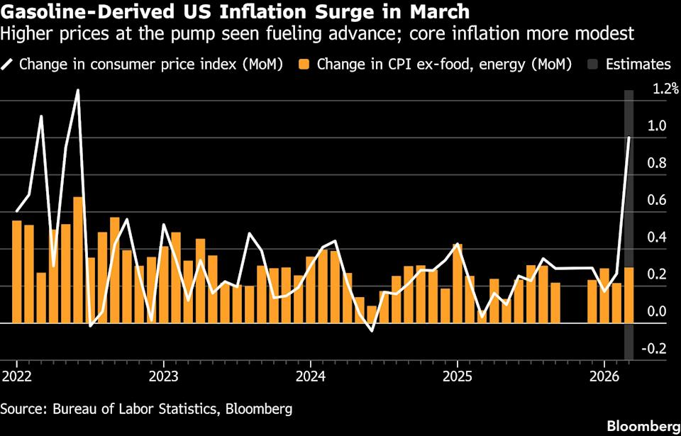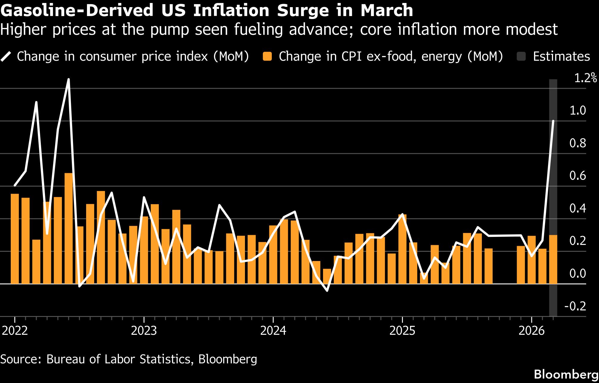 (Bloomberg) — The sudden increase in US gasoline prices felt by American consumers is set to be on full display in key inflation data due out this coming week. Economists are penciling in a 1% increase in the consumer price index for March — the sharpest one-month advance since 2022 — after the Iran war pushed gas prices at the pump up by about $1 per gallon. At the same time, the core CPI, excluding energy and food, probably rose 0.3% from a month earlier, according to a Bloomberg survey ahead of the Bureau of Labor Statistics report due Friday. Oil prices have been roiled by five weeks of conflict, climbing to almost $120 a barrel last month as key Middle East energy assets came u nder attack and Iran effectively closed the critical Strait of Hormuz, creating what the International Energy Agency called the biggest supply disruption in the history of the market. OPEC+ warned on Sunday that damage to Middle East energy assets will have a prolonged impact on oil supply even after the Iran war ends, as it approved a symbolic increase in output quotas for next month. A day ahead of the CPI, the Federal Reserve’s preferred gauge of inflation will offer a snapshot of pre-war price pressures. Economists see the so-called core personal consumption expenditures — PCE — price index, which excludes food and energy, having risen by 0.4% for a third month in February, suggesting progress toward tamer inflation was stalling even before the conflict. Combined with signs of stabilization in the US labor market, stubborn price pressures along with new inflation risks stemming from war in the Middle East help explain why the Fed may struggle to lower interest rates this year. “March’s gangbuster payrolls print and lower unemployment rate certainly don’t boost the case for the Fed to resume cutting rates anytime soon. Data this coming week also won’t likely make the case for rate reductions.” —Anna Wong, Stuart Paul, Eliza Winger, Chris G. Collins, Alex Tanzi & Troy Durie. The mid-week release of minutes from the central bank’s March policy meeting may shed light on officials’ concerns about inflation or the potential economic impacts stemming from the Iran conflict and related disruptions to energy and other commodity flows. In addition to the PCE price data, the Bureau of Economic Analysis’ report will include figures on personal spending as well as incomes. Economists expect a modest increase in inflation-adjusted spending. Other reports in the coming week include the Institute for Supply Management’s March services activity index, due on Monday. And on Friday, the University of Michigan will issue its preliminary April consumer sentiment index. In Canada, the March labor force survey will offer a first look at how surging energy costs may be filtering through to job growth and unemployment. Economists expect the jobless rate to tick up to 6.8%. Elsewhere, central banks from Poland to India and New Zealand may keep policy steady as they monitor events in the Middle East, while inflation gauges from China to Latin America will point to the impact on living costs. Asia gets three rate decisions this week, with the focus falling on how authorities assess risks to prices and growth from the Middle East conflict. The Reserve Bank of New Zealand is expected to hold its cash rate at 2.25% on Wednesday for a second straight meeting after Governor Anna Breman said she won’t rush into raising the benchmark in response to the Iran war. Pricing in the overnight swaps market shows traders see a roughly 58% chance of an increase by the meeting in July, though economists see a longer hold. On the same day, India’s Reserve Bank is forecast to keep its repurchase rate steady at 5.25%, while on Friday, the Bank of Korea — in the final meeting of Governor Rhee Chang Yong’s tenure — is all but certain to keep settings unchanged as well. Data highlights include inflation updates from the Philippines, Thailand and Taiwan. China’s key inflation gauges for March, due Friday, will likely reflect the impact of soaring energy costs. Consumer inflation may accelerate again after picking up to the fastest pace in three years in February. Likewise, factory-gate deflation may narrow further after registering the slowest clip in more than a year in the previous month. Japan releases wage data for February on Wednesday, with a focus on the inflation-adjusted gauge after it turned positive in January for the first time in more than a year. Singapore releases retail sales figures for February on Monday, and New Zealand’s manufacturing PMI for March is due Friday. Multiple euro-region industrial reports will draw attention, although their focus on February — before war began in the Middle East — may limit their utility for investors. German factory orders on Wednesday, followed by production and export numbers on Thursday, will offer a glimpse of manufacturing in Europe’s biggest economy at a time when the flow of defense-focused stimulus is building. Those two days will also feature French export numbers and Spanish production data, followed by Italian factory statistics on Friday. Appearances by euro-zone central bankers and Bank of England policymakers will be sparse during a week shortened by the Easter holiday. Inflation numbers from several economies will draw attention, highlighting how the energy squeeze in the Gulf is impacting consumers. Last week’s euro-zone reading showed the biggest jump since 2022. Reporting from the Nordics are Sweden on Tuesday and Norway on Friday, both of which may have experienced accelerating price growth. Hungary’s inflation on Wednesday is also seen quickening notably above 2%, in a report arriving just days before the country’s highly anticipated election. On Thursday, Egypt’s consumer-price growth is expected to show another uptick from the 13.4% level in February, after energy costs soared and the pound fell to a record low. A number of 