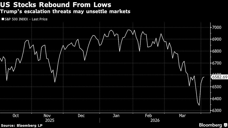 (Bloomberg) -- US equity-index futures fell and oil extended gains after President Donald Trump signaled a sharp escalation in the Iran war, heightening the risk of an energy shock already weighing on the global economic outlook. Futures contracts for the S&P 500 Index retreated 0.2% as traders trimmed bets in equities on concern the higher energy prices will fan inflation and hurt economic growth. Brent rose 2% to trade above $111 a barrel as trading started on Monday, taking gains this year to more than 80%. Gold fell 1% to about $4,630 an ounce. The Bloomberg Dollar Spot Index rose 0.1%. Trump renewed threats early Sunday to attack Iranian infrastructure if the key energy-shipping route through the Strait of Hormuz remains closed. He followed it later with another that said: “Tuesday, 8:00 P.M. Eastern Time!” with no further explanation. The president’s comments came as OPEC+ warned that damage to Mideast energy assets will have a prolonged impact on oil supply even after the conflict ends. Yet there are few signs of progress toward a ceasefire as attacks have continued to flare around the region, keeping oil prices hovering well above $100 a barrel. “The prediction game remains quite tricky for investors,” said Homin Lee, a strategist at Lombard Odier in Singapore. “Investors’ focus will squarely be on military actions on both sides of the Persian Gulf and whether or not Hormuz vessel crossings can improve further despite these attacks.” The fallout from the war has rapidly darkened the economic outlook by threatening to cool growth and push up already elevated inflation, roiling bets on whether the Federal Reserve will resume cutting interest rates later this year. Attention remains firmly on energy prices and the closure of the Strait of Hormuz — a waterway crucial for the flow of oil from the Middle East. Investors will watch for the impact of the surge in crude oil when monthly US inflation data is released Friday. The roughly $1-per-gallon increase in US gasoline pump prices probably drove the March consumer price index up 1%, the most since the post-pandemic inflation surge in 2022, according to an economist survey before the report is published. What Bloomberg strategists say... Global investors will be keeping to a defensive posture as President Donald Trump issued threats to destroy Iran’s power plants. The narrative of weaker stocks and bonds, amid a strong dollar is set to prevail as traders see the Iran war in an escalation mode with no immediate sign of an off-ramp. — Mark Cranfield. MLIV. For full analysis, click here. The S&P 500 is coming off its biggest weekly gain of the year, a 3.4% jump fueled by short covering and speculation early in the week that Trump was poised to begin wrapping up US military operations. The gains left the index just 5.7% below its January record. But on Thursday, the last trading day of the holiday-shortened week, US stocks initially opened lower after Trump’s televised evening address dashed optimism he would layout a solid timeline for concluding the war. Equities later recovered the losses on reports that Iran was talking with Oman about ways to handle shipping traffic through Hormuz. Even so, West Texas Intermediate crude ended above $110, rising 11% Thursday, while the global Brent benchmark settled near $109. Meanwhile, OPEC+ warned that damage to Middle East energy assets will have a prolonged impact on oil supply even after the Iran war ends, as it approved a symbolic increase in output quotas for next month. Meanwhile, on Friday, US Treasuries fell after a stronger-than-forecast reading on March employment prompted traders to pare bets on Fed rate cuts. That marked a shift from much of last week, when bonds gained as the attention shifted from the inflation implications of the energy-price spike to speculation that rising costs to consumers and businesses will slow the pace of growth. Yields on two-year Treasuries climbed four basis points to 3.84%. The US added 178,000 jobs last month, higher than all estimates in a Bloomberg survey. “This makes it somewhat less likely that the fed will be pushed into ‘bad news’ cuts motivated solely by labor weakness,” Krishna Guha, head of central bank strategy at Evercore ISI, wrote in a note. “The fall in unemployment pre-war does edge up the risk of a Fed hike, but we continue to think this is very unlikely in 2026.” Meanwhile, the Islamic Republic’s continued attacks damaged Kuwait’s oil headquarters and shut down an Emirati petrochemicals plant. Fifteen ships have passed through the Strait of Hormuz with permission from Iran, semi-official Fars news agency reports, citing the latest data on strait traffic. Trump has previously dialed back his escalation threats, including two weeks ago before markets reopened for the week. Trump also said he plans to hold a news conference at 1 p.m. New York time on Monday. “Trump is probably serious in his expressed desire to step away after two or three more weeks,” Lombard Odier’s Lee said. “But the obvious path-dependency inherent in the conflict suggests that his attempt to carry out a final round of aggressive strikes can backfire significantly for the markets.” Corporate News: Hon Hai Precision Industry Co. reported a 29.7% rise in quarterly sales, a sign of sustained AI demand during the first weeks of war in the Middle East. Deutsche Lufthansa AG sees potential bottlenecks for jet fuel availability should the conflict in the Middle East turn into a longer war. Some of the main moves in markets: Stocks S&P 500 futures fell 0.3% as of 8:05 a.m. Tokyo time Currencies The Bloomberg Dollar Spot Index rose 0.1% The euro was little changed at $1.1514 The Japanese yen was little changed at 159.66 per dollar The offshore yuan was little changed at 6.8868 per dollar Cryptocurrencies Bitcoin rose 1.1% to $68,363.63 Ether rose 0.8% to $2,084.8 Commodities West Texas Intermediate crude rose 1.5% to $113.18 a bar