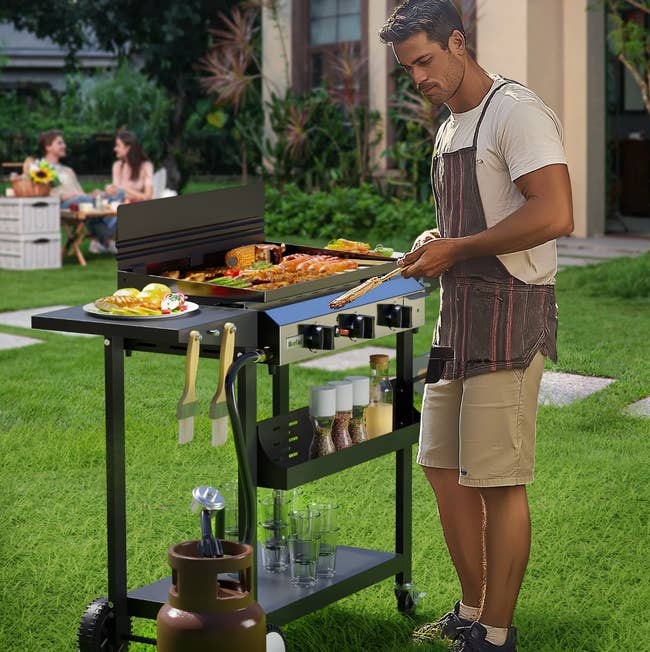 Promising review: "My fiancé is very pleased. Pretty simple set up, he did need his open-ended wrench to put the wheels on. We bought it for camping and it's the perfect size! Has all the necessities like a splatter back, grease tray, 2 side tables, 6 hooks for utensils, and a rack for spices and such." —Catherine