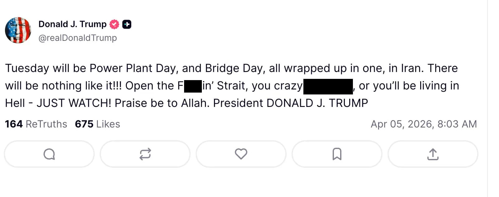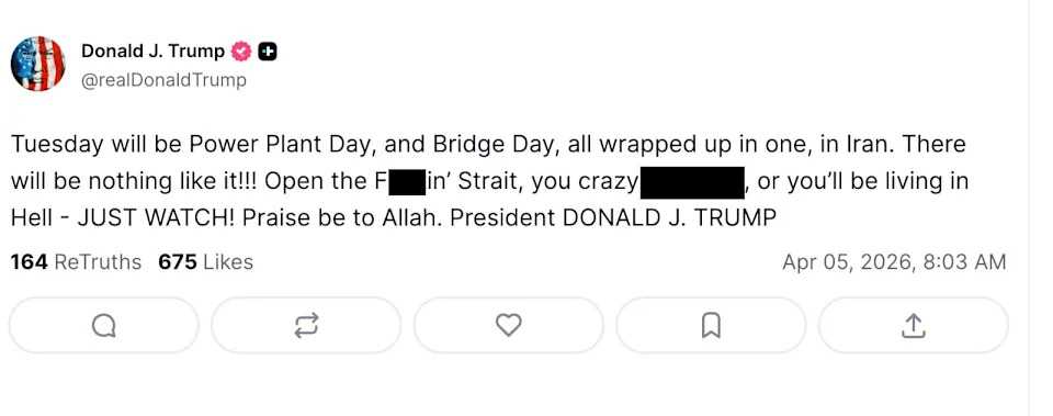 President Donald Trump has attempted to limit the fallout from his bizarre expletive-laden tirade early on Easter Sunday morning. Just after 8 a.m., the president shared a message for Iran on Truth Social, writing, “Tuesday will be Power Plant Day, and Bridge Day, all wrapped up in one, in Iran. There will be nothing like it!!!” “Open the F----n’ Strait, you crazy b-----ds, or you’ll be living in Hell - JUST WATCH!” he continued, adding, “Praise be to Allah.” He then proceeded to skip church on the holiest day in the Christian calendar, opting instead to host an Easter dinner with first lady Melania Trump and enjoy a “ceremoniously slow” presidential motorcade tour around Washington D.C. His tour of D.C. took him around Memorial Circle, near the site of his planned presidential arch, and included a stop at Trump National Golf Club in Sterling, Virginia. He also found time to speak with Fox News. Foreign correspondent Trey Yingst told the hosts of Fox & Friends that he had a 15-minute phone call with the president about Iran. In their phone call, the president doubled down on his earlier threat, reportedly telling Yingst, “If they don’t make a deal, and fast, I’m considering blowing everything up and taking over the oil.” Yingst continued, “The president went on to say, ‘You’re going to see bridges and power plants dropping all over their country.’” Perhaps realizing that ignoring the significance of Easter Sunday would not appeal to the president’s many Christian supporters, the White House then changed tack, with both the president and the White House posting a video of artist Vanessa Horabuena painting an image of Jesus Christ. “Vanessa is AMAZING!” Trump wrote on Truth Social hours after his tirade. The White House then reposted the video, quoting him. The president previously hosted Horabuena at Mar-a-Lago for his lavish New Year’s Eve party, where she painted a portrait of Jesus in 10 minutes on stage that was then auctioned off for $2.75 million. She also painted the president at the Liberty Inauguration Ball in January 2025, and painted a different portrait of the president that replaced one he disliked that was on display in Denver. The posts about Horabuena’s artwork were joined by several others from multiple government agencies celebrating Jesus’ resurrection. While presidents regularly acknowledge religious holidays, government departments doing so is unusual. “He is risen,” read a message posted by Secretary of State Marco Rubio and reposted by the State Department on X. The Department of Homeland Security posted a graphic featuring The Resurrection of Christ by Peter Paul Rubens and the text, “He is not here, but is risen,” from Luke 24:6. The Pentagon shared a message originally posted by Defense Secretary Pete Hegseth that read, “The tomb is empty. The promise is fulfilled. Through His sacrifice, we are redeemed. We stand firm in faith, courage, and truth—Happy Easter.” Attached was another graphic quoting Luke 24:6. The Justice Department wrote on X, “Today, as millions of Christians gather in their churches across the nation to celebrate the resurrection of Christ, this Department of Justice is proud to protect and defend religious liberty.” The president, who was raised in his mother’s Presbyterian faith, began openly expressing fears about not getting into heaven last year. “I don’t think there’s anything [that’s] going to get me in heaven. Okay?” He told reporters in October. “I think I’m not maybe heaven-bound.” In February, he told a crowd in Georgia that he loves to joke about his chances of getting into heaven before soberly adding, “I hope to make it. But I doubt I will, to be honest with you. A lot of you will. I’m not so sure.”