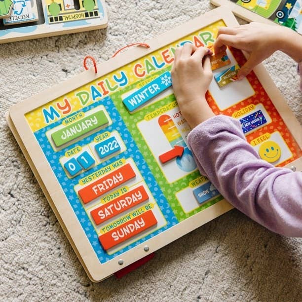 Promising review: "This calendar was purchased a few months ago. It came in perfect condition and included everything shown. I was able to hang it up with a thumb tack, and it's still hanging up well. I like how it's like a whiteboard, so if magnets are lost, you can use a dry-erase marker! That's honestly my favorite feature since my household is like a zoo with three hyperactive boys, all 11 years and younger. Things get lost around here. Lol. It's a very helpful tool for homeschooling, and our mornings have more structure with it! It gives us lots of opportunities for him to (excitedly) learn about weather, holidays, days of the week, etc!" —Eric