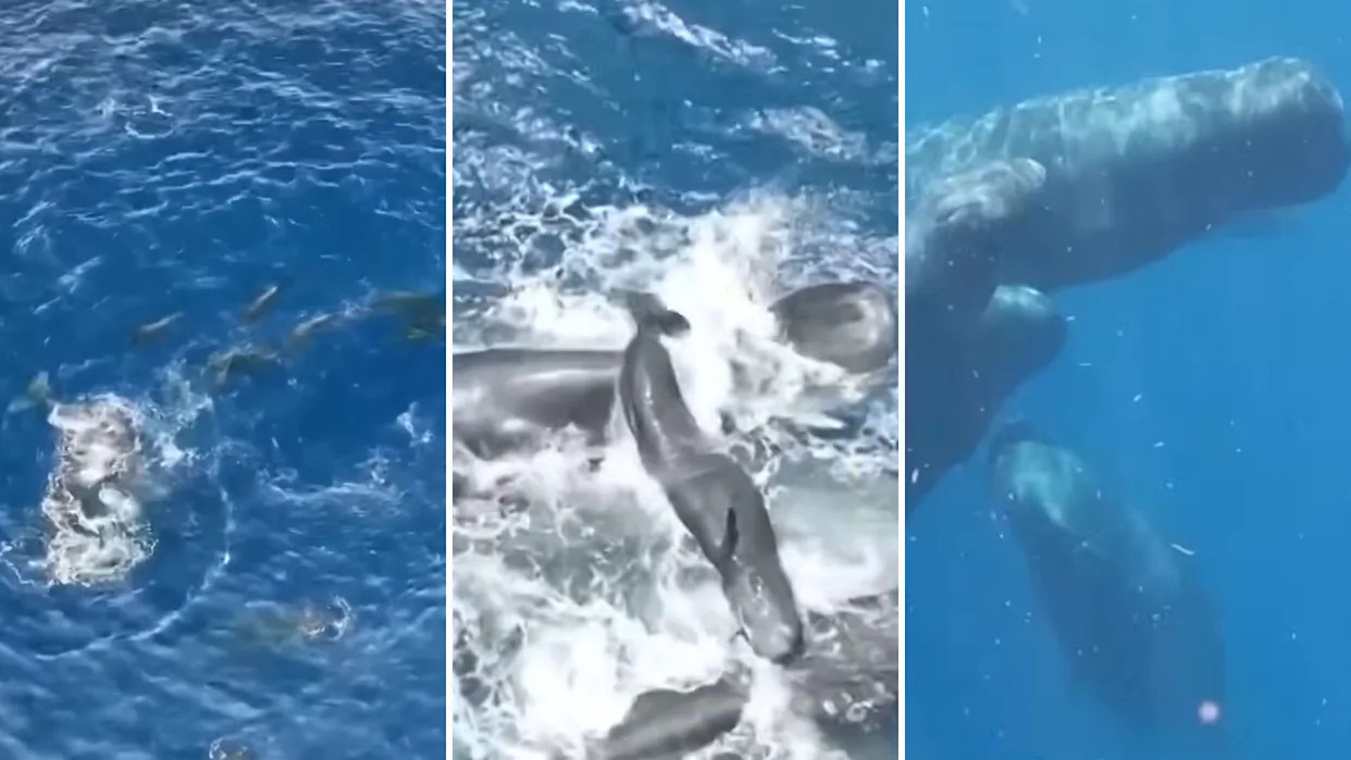 Rare footage shows 10 female sperm whales lift newborn to surface for first breath