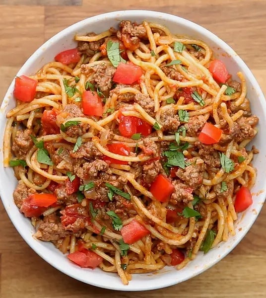 A spaghetti bowl is a total classic. For an extra touch, this one-pot recipe adds taco seasoning, cheese, and cilantro. Delicious? We think so.