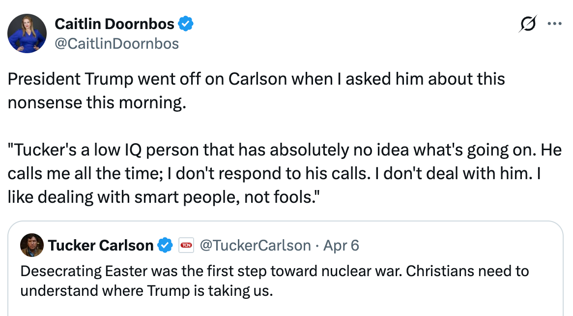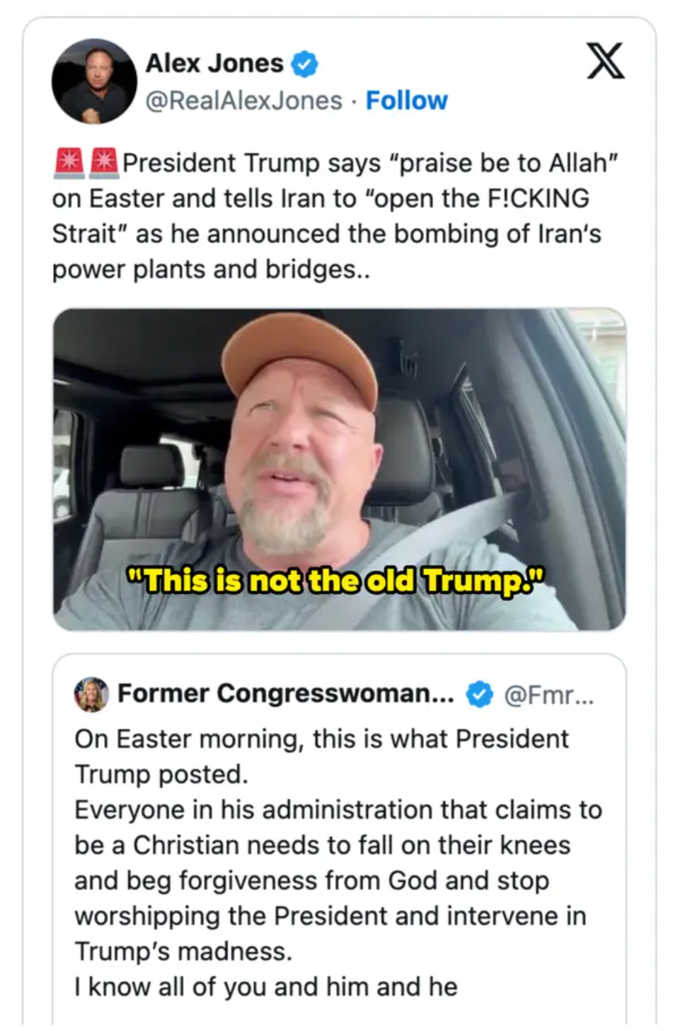 Just waiting for the “we told you so...” comment. I'm an LA-based trending news writer covering health, politics, and internet culture. Why am I agreeing with Marjorie Taylor Greene https://t.co/DfgOydNExa 25TH AMENDMENT!!!Not a single bomb has dropped on America. We cannot kill an entire civilization. This is evil and madness. pic.twitter.com/2mdogDRZN4 I truly believe that @realDonaldTrump isn’t just the leader of the free world, but the savior of it as well.May God bless America— the last stand for western civilization. The 25th amendment needs to be invoked. He is a genocidal lunatic. Our Congress and military need to intervene. We are beyond madness. https://t.co/b60wlO4OuW President Trump has openly announced a plan to conduct the EXACT definition of genocide against the Iranian people! The MADNESS MUST STOP NOW!! https://t.co/H1wUCmm9r8 pic.twitter.com/m8iJclOQwO 🚨Tucker Carlson just went off on Trump on Easter morning.The full statement:“No decent person mocks other people’s religions. You mock other people’s faith — you mock the idea of faith itself. We are not God. Only if you think you are do you talk this way.”“This is not a… pic.twitter.com/cHMVvDN3Tm Tucker Carlson implores White House staffers to say no Trump's orders pic.twitter.com/pfmMvCvP9Z "Do not vote in the midterms, and if you do, VOTE DEMOCRAT! This administration needs to be SHUT DOWN!" - Nick Fuentes to Trump supportersi just agreed with Nick Fuentes, i think I'm gonna be sick