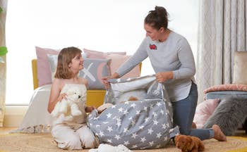 Promising review: "These are perfect for any kids’ room! I was getting so tired of messy stuffed animals and blankets all over, so it’s nice to have them out of sight but still easily accessible. My 2-year-old loves to sit on hers and read books. She doesn’t have a ton of stuffed animals, so there is plenty of room to add to it for when her collection grows. I love the fun, bright print and sturdiness — she drags it all over the ground, but I don’t worry about it tearing at all. Just what she needed in her room." —dd