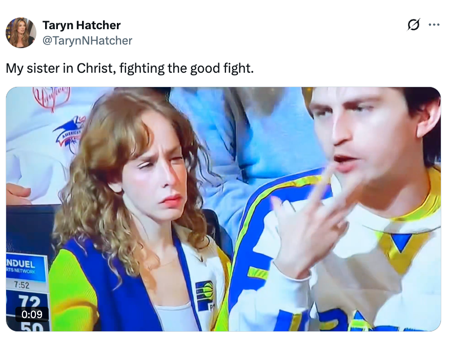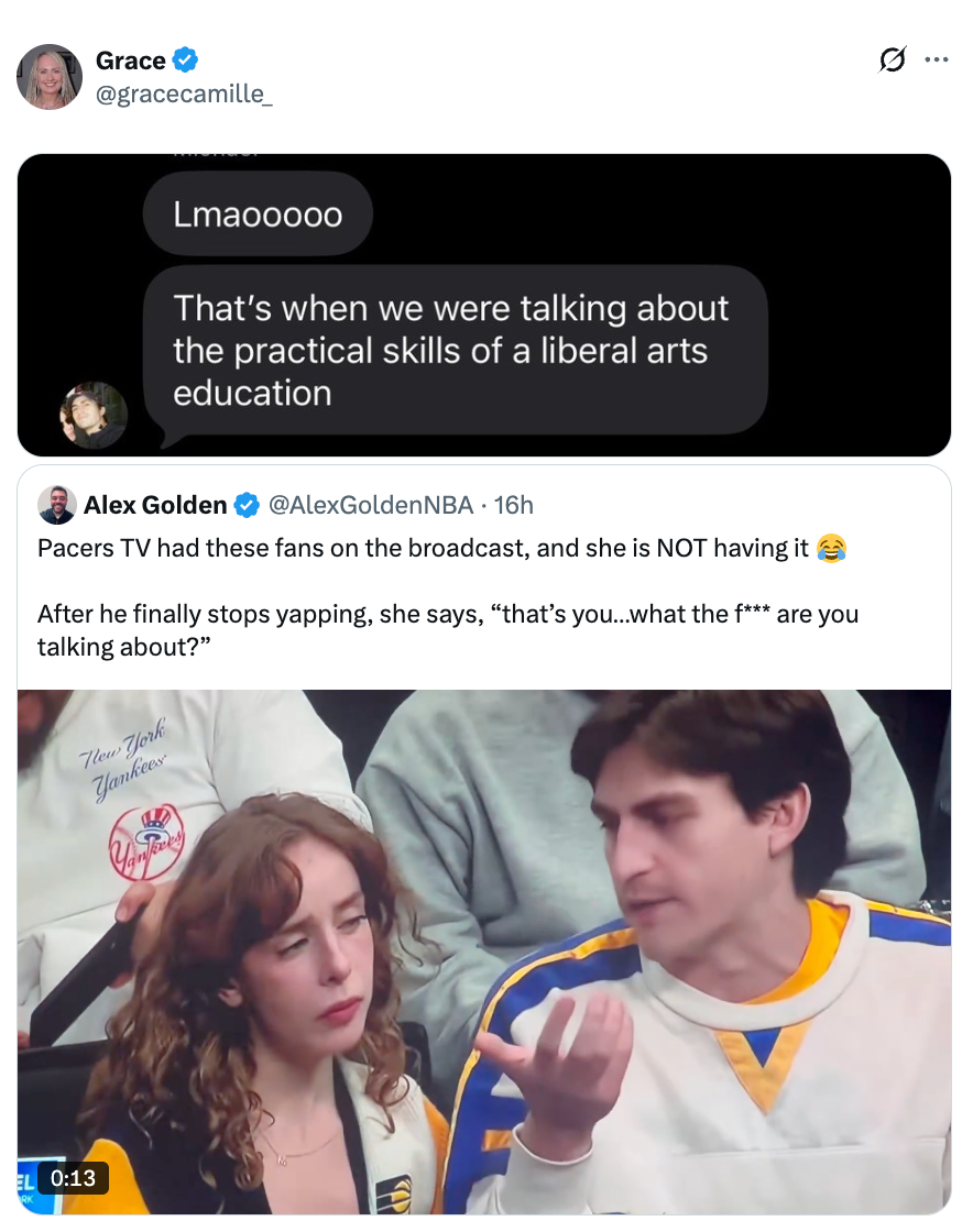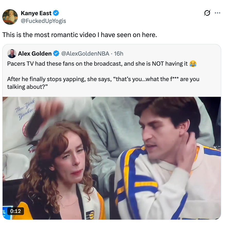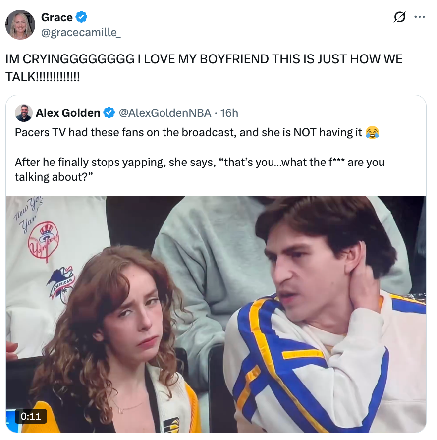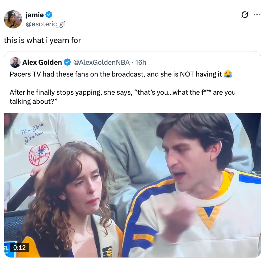 Pacers TV had these fans on the broadcast, and she is NOT having it 😂After he finally stops yapping, she says, “that’s you…what the f*** are you talking about?” pic.twitter.com/XdXMC6xhE9