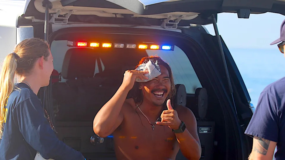From the looks of it, and the surfer's smiling face, the injuries appeared to be fairly minor.