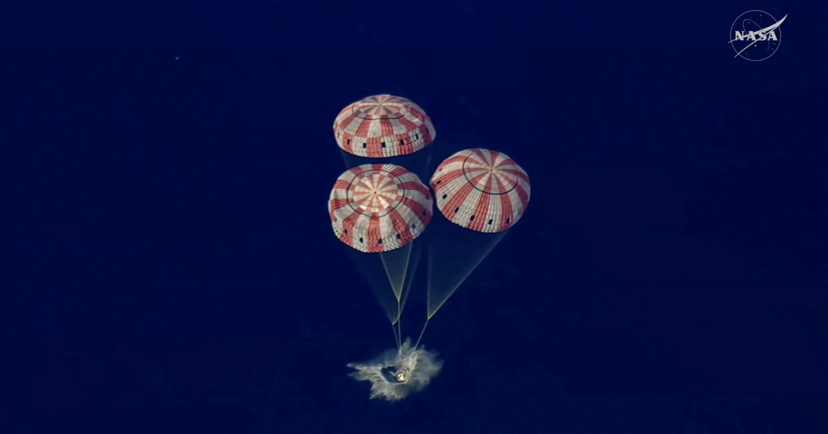 The crew successfully completed a parachute landing on Friday in the Pacific Ocean, after a high-speed re-entry through Earth’s atmosphere. Recovery teams were off the coast of California, waiting to retrieve them after their arrival at 5:07pm Pacific time (00:07 GMT).