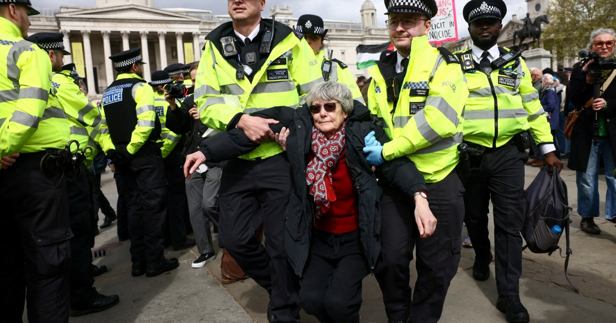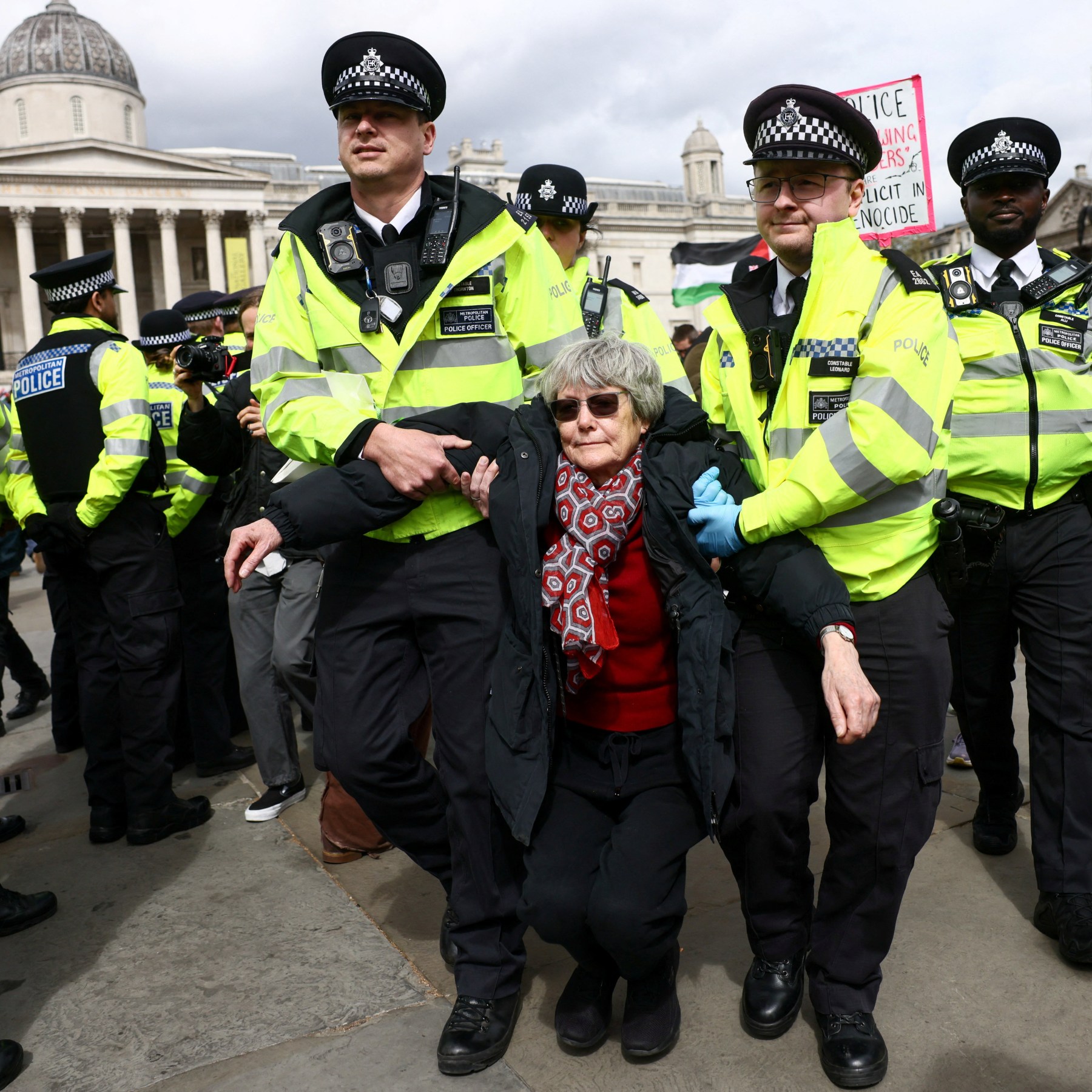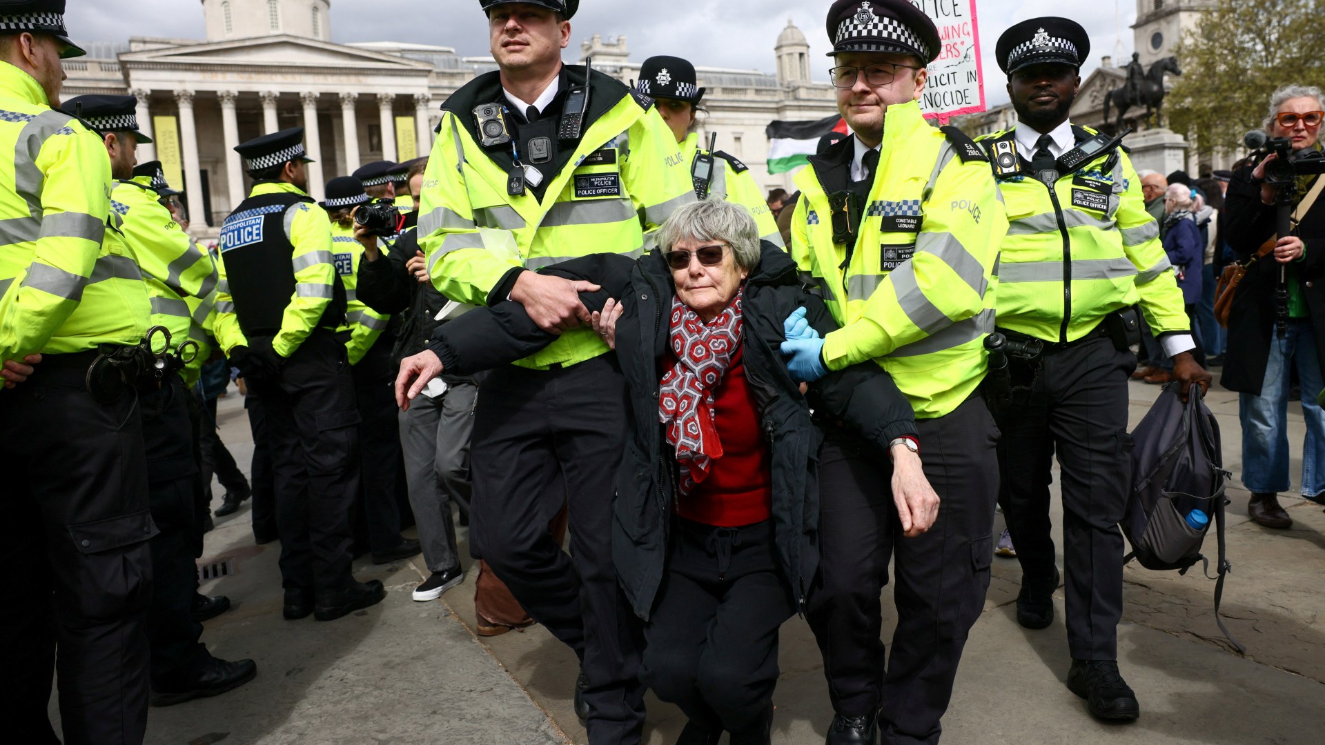 Hundreds of people gather in Trafalgar Square for demonstration, as elderly woman with cane is escorted away by police.