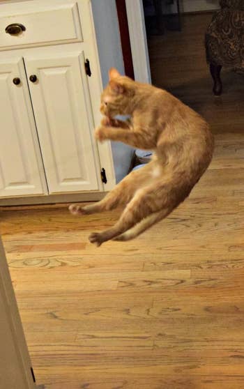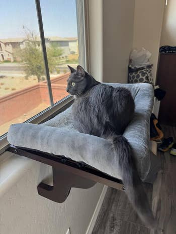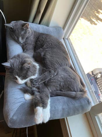 We hope you love our recommendations! While every product is independently chosen by our editors, BuzzFeed and our publishing partners may collect a share of sales or other compensation from the links on this page. You can read more about how our affiliate partnerships work in our Editorial Standards & Ethics Guide. Your kitties will be purring for their toys, treats, and even a self warming bed where they’ll be living out their best lives. As cat owners, we know how expensive of a commitment it is, from the vet visits to the constant restocking of food, litter, and other necessities — so spending even more money on cat products that don't work or don't last just isn't feasible. But if you're like me, you're always looking for ways to make life easier or make your kitties happier, and the products in this list can help you do just that, from problem-solving gems to simple toys that'll make them *literally* jump for joy. The tens of thousands of 5-star Amazon ratings are reason enough to add the ChomChom to your cart immediately — but let me add my own personal review to the stack. I've been using the ChomChom for quite a while now, and I took the photos above to show just how quick, easy, and effective this roller is. It took 10 seconds to rid my velvet couch ottoman of the hair my two gray kitties are constantly leaving everywhere. It takes a bit of practice to get the hang of using this roller — at first, I thought you only brushed down in one direction, and was confused why it wasn't picking up hair. It's important to do a push-and-pull brushing in *both* directions so it actually pulls the hair inside, which does require you to apply a bit of pressure. Afterward, you'll just dump out the hair that's been trapped inside. The ChomChom is best for large flat surfaces like couches and beds. Get it from Amazon for $19.99+ (available in three colors). I've been using this trapper mat for over a year now, and while it's pretty much impossible to eliminate all litter from your home if you own even one cat, let alone multiple, this mat has made keeping the floor of my litter box room MUCH more manageable. Unlike other mats, where the litter just kind of sits on top and eventually gets kicked elsewhere, this mat is designed so that the litter falls through the holes and stays inside the mat until you're ready to dump it. It's made out of an EVA material that's supposed to be gentle enough for cat paws, and my two kitties don't seem to have a problem walking on it. I *highly* recommend getting one of the larger sizes (I have the 30-by-24-inch mat) to extend the coverage area. Note that the mat will probably have a fold down the middle when it first arrives, but just give it some time and weigh it down with something if needed; it'll lay flat. Get it from Amazon for $13.99+ (available in four sizes and four colors). Carpet messes are undoubtedly the worst to clean up — it's "funny" how they always choose to have their accident there — but you can also use this on clothes and other surfaces like concrete and hardwood. Just be sure to follow the instructions carefully for non-carpet use. When it comes to my own experience with Rocco & Roxie, well...let's just say we're no stranger to cat accidents 'round these parts, and I keep this stuff stocked at all times. Between my younger one's hairballs and my older one's vomiting, I've accidentally stepped in piles of yuck more times than I care to count, and this bottle is what I reach for whether the mess is on my hardwood floor or carpet. It always lifts the stain, without any detectable odor left behind. Get it from Amazon for $23.92+ (available in two sizes and two scents). To install, just hook the cat perch into the rail of the window, push the brackets forward until they rest against the wall, then tighten the thumb screws. Check that your window matches the size requirements on the listing before buying! There's a helpful graphic (second photo on the listing) that shows the dimensions required. Promising review: "My cats are obsessed with these window beds. I have now ordered several of them to have in different rooms. Easy to put together and sturdy enough to hold several 12+ pound cats." —Laura Williams Get it from Amazon for $28.99+ (available in four colors and two sizes). Promising review (get ready, this is my favorite cat name ever): "My cat Gambino Bambino would let you brush him bald!!! He loves to be groomed and comes running whenever the brush comes out. Though we love to accommodate, I know he wanted more. He was constantly rubbing his cheeks and ears on the corner of our walls to get even more scratching. I finally came across this product and knew he would love it! It took a little convincing, but once he got the hang of it, he’s been loving it! We have one in the living room, one in the kitchen, one at the top of the stairs, and one in the guest room! He is having a great time!!! Very easy to put together and place on the wall." —T. Mangiaracina This is THE cat bed, y'all. Neither of my cats have ever really taken to a cat bed and much preferred to doze on their cat tree or curl up on a regular blanket — until I finally caved in and bought the Aspen self-warming bed a while back. IMMEDIATELY upon placing it on my couch, one of my cats crawled into it and happily began napping. As soon as he moved away, my other cat jumped in to take it for a test run as well — and immediately curled up as well. After about a week of them taking turns using it (literally, the cat *not* in the bed would lay next to it waiting for the other to leave — my polite boys 🥹), I realized I needed to buy a second one. They immediately took to that one as well, and now, they both have access to their favorite bed whenever they like! Whenever I put my hand underneath them, I can definitely feel how warm they are underneath, so the bed's self-warming feature seems to work well. I think what they love most about it is the shape and how 