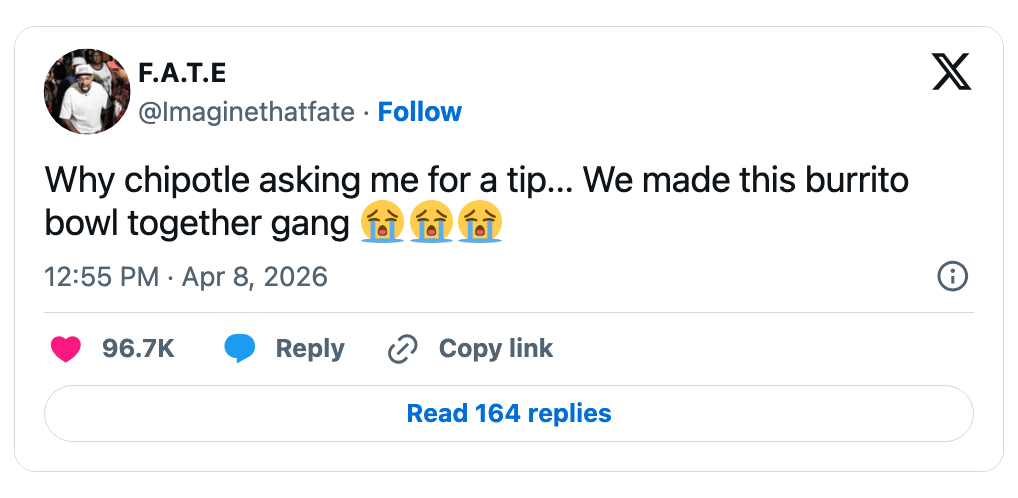 β€œWhy chipotle asking me for a tip... We made this burrito bowl together gang.”