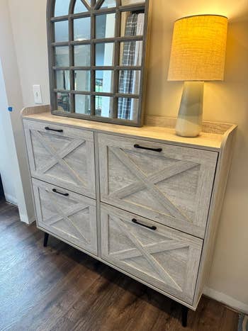 Promising review: "Our front entry room has been a minefield of shoes all over the floor. I nagged and pestered my kids and husband to stack their shoes on our tiny shoe shelf or to take shoes they don’t use much to their rooms, but still, there was a pile. And I had no idea what to do about it. Until I saw a reel of a shoe cabinet like this one! Our whole family is using it, and my entry room floor is finally shoe-free. The shelf is beautiful. It went together easily, and the drawers closed perfectly. It has completely solved this problem for me. I am obsessed with my new shoe cabinet, and I highly recommend it to anyone. One word of caution: My husband has size 10.5 (in men’s) feet, and his shoes have to go in at sort of a diagonal to make them fit, and I think he can only get five or six pairs into his drawer. I wear size 10.5 in women’s, and mine fit just fine." —Jeri