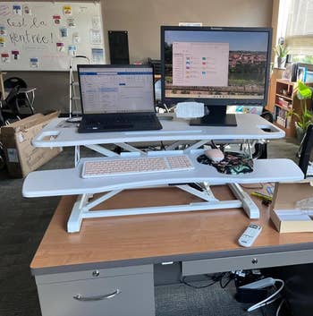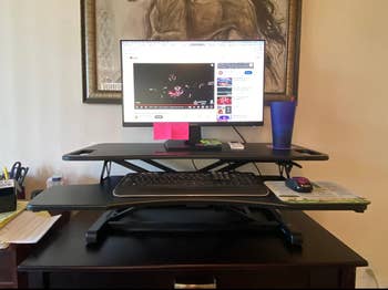Promising review: "I've been looking at these for months and finally decided to buy one. Super happy with my purchase. I didn’t want to replace my entire work desk, so I opted for this. The entire unit slides up and down easily. Plenty of room around the monitor for speakers, pens, notes, and even a fan. Easy assembly. Not too heavy. I’ve really enjoyed being able to stand at my desk. I’ve been struggling with lower back pain, and standing more seems to be helping. I find myself wanting to stand more often than I thought." —halaly