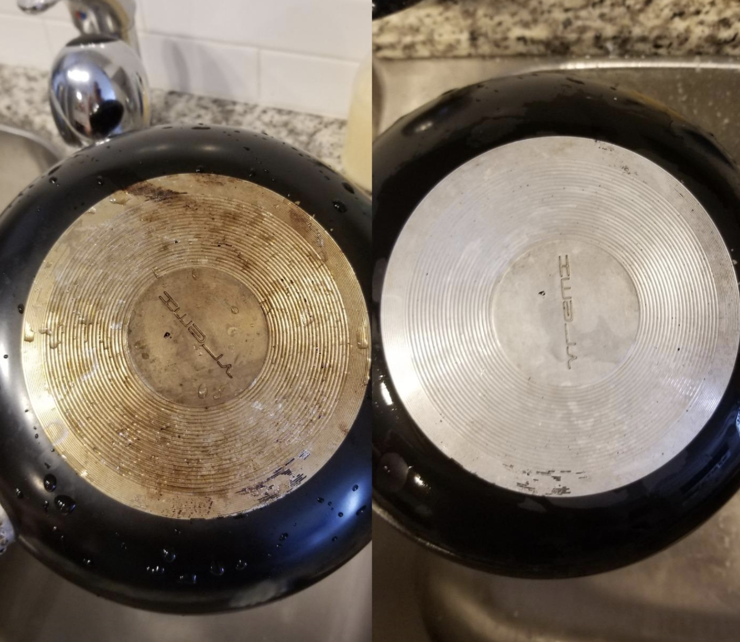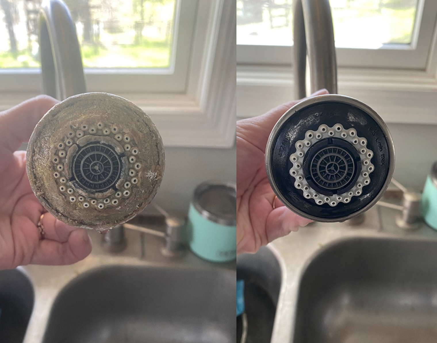 Promising review: "The photo says it all. I have tried so many things to get the hard water build-up off of this faucet and nothing works. It's hard as a rock! I left it soaking for about an hour in a non-diluted mix and was able to scrub it all off easily. So happy and going to use this for other hard water issues in our house." —Mar