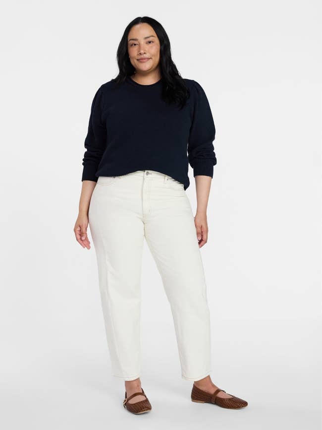 Promising review: "Fit is exactly as the straight leg. The length is perfect . I like that the barrel leg isn't too exaggerated. Being short it can be overwhelming. I can say how they wash up yet but I have three pair of the straight leg and they are the same weight of denim." —Laurie