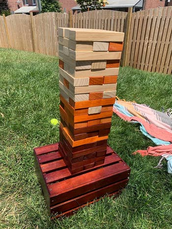 Promising review: "This Giant Tower Game is great for family game night, outdoor activities, and picnics/parties! The blocks of wood are beautifully cut and stained, and store neatly in the equally beautiful crate that also serves as the game base. The game is fun to play, and can easily reach the three-foot height as the game nears an end. My only word of caution is to wear shoes and watch out for tiny feet when the blocks fall, since they are sturdy and durable. If you have kids, the game doubles as a really cool building blocks set, too! This game would make a great gift for anyone who loves games or loves to host parties!" —LexieLooDylan2