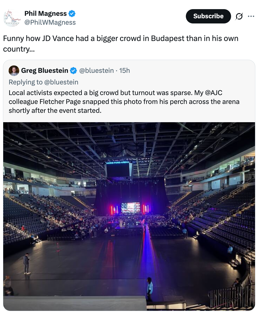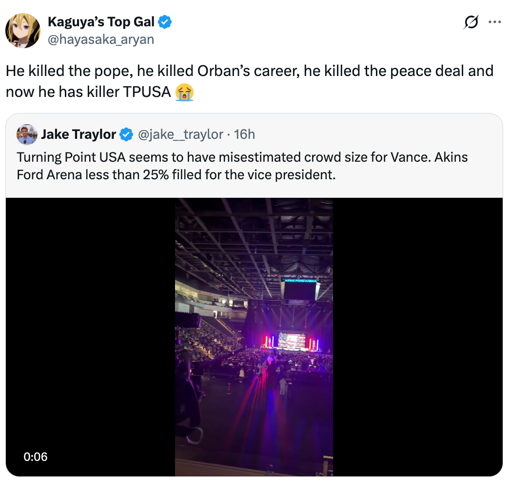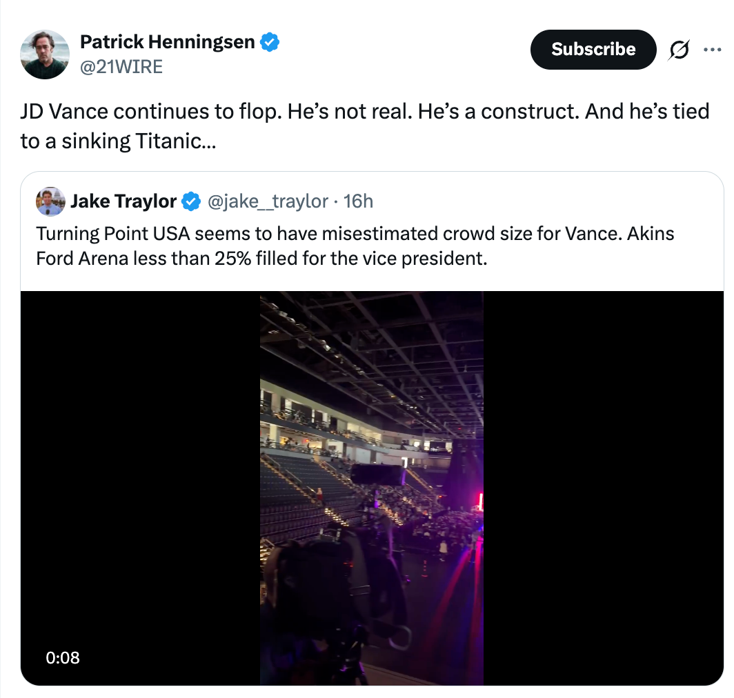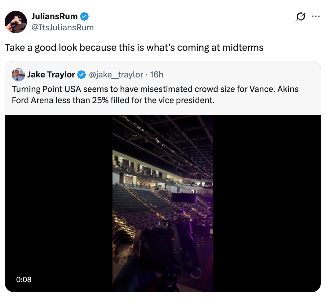 Turning Point USA seems to have misestimated crowd size for Vance. Akins Ford Arena less than 25% filled for the vice president. pic.twitter.com/K2SnkmuATh