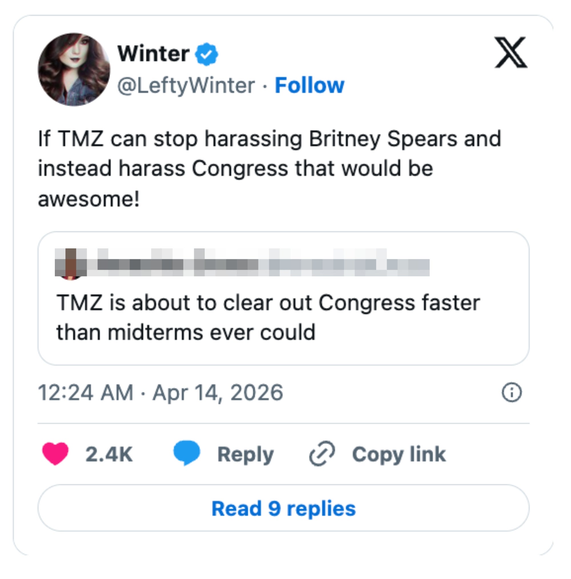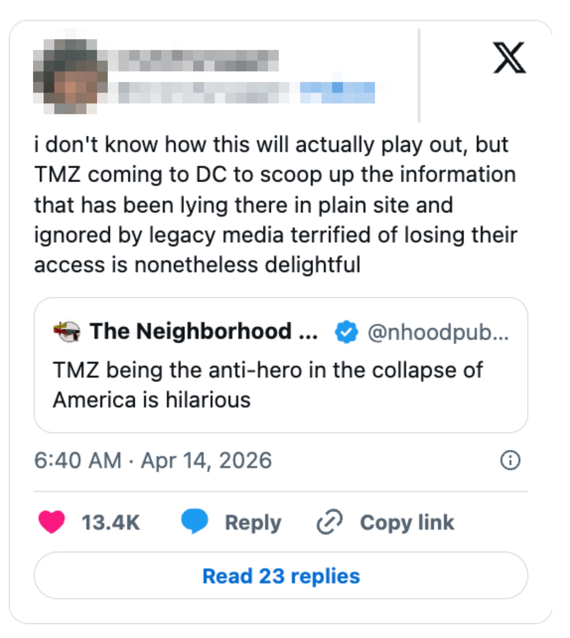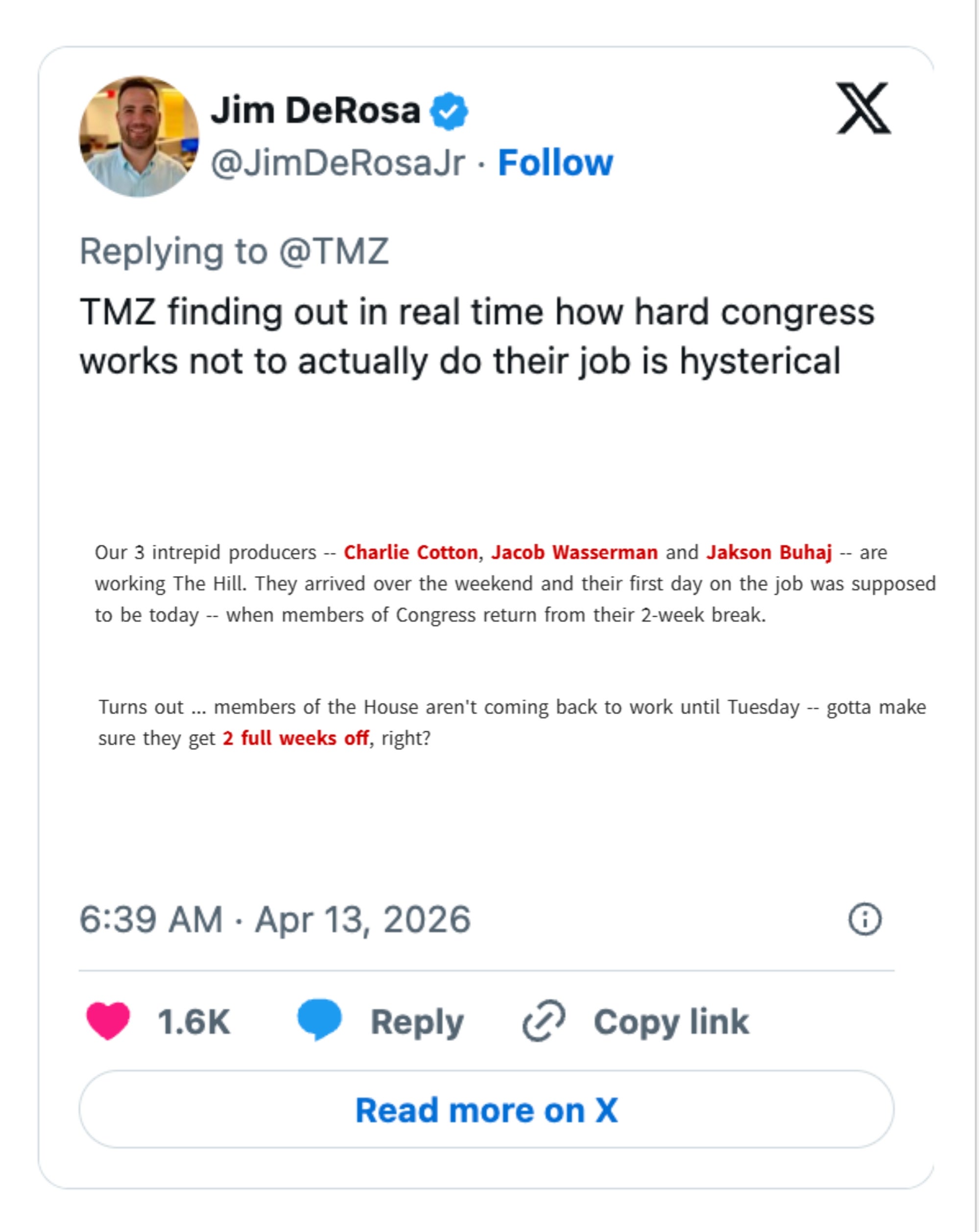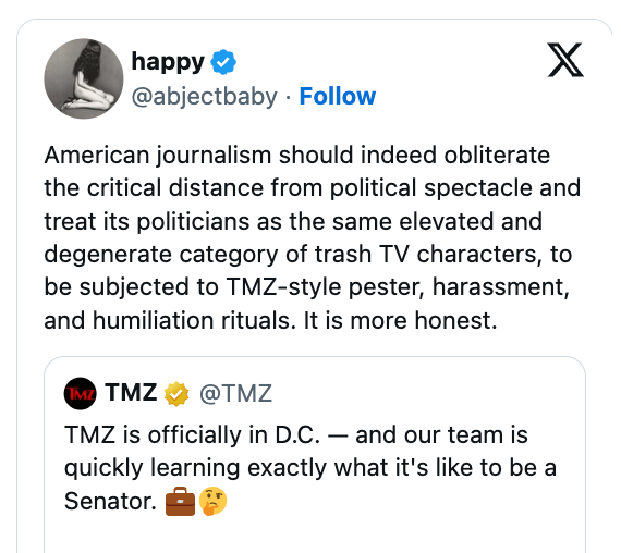 I'm an LA-based trending news writer covering health, politics, and internet culture. TMZDC Staff Starts Today!!! https://t.co/KmnBdeJTaA pic.twitter.com/s7wpG8lMtW Give @TMZ a White House press badge for the briefing room. I am not joking. TMZ in D.C. is about to do what Congressional ethics committees should have been doing for decades.It’s time to expose every single crooked, perverted, abusive, and corrupt degenerate on Capitol Hill.Republican and Democrats, it’s time to take out the trash. I can’t stand TMZ… but them setting up shop in Washington, DC to follow politicians might be the most glorious thing I’ve ever seen. Just wait—staffers and interns are about to start cashing in left and right, dropping receipts for a quick payday. This could get ugly fast. Oof. TMZ got the entire Congress shook and hiding under their desks pic.twitter.com/DUymUHxg5a Every politician’s worst nightmare right now… pic.twitter.com/bgDFpfjgGK