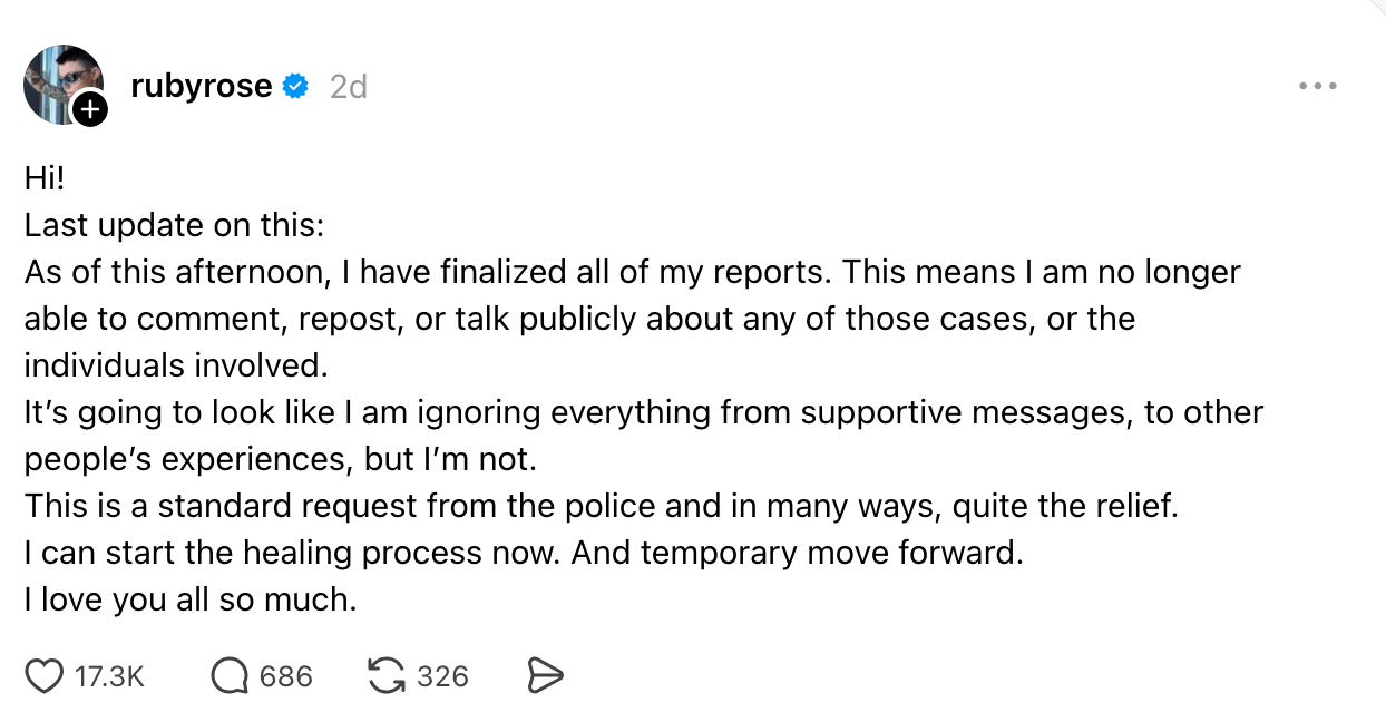 “This is a standard request from the police and in many ways, quite the relief. I can start the healing process now. And temporary move forward. I love you all so much,” she said.