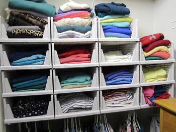 We hope you love our recommendations! While every product is independently chosen by our editors, BuzzFeed and our publishing partners may collect a share of sales or other compensation from the links on this page. You can read more about how our affiliate partnerships work in our Editorial Standards & Ethics Guide. If your current method of organization could best be described as “big ol’ pile,” we’re here to help. Promising review: "Saves so much space in my closet! Very sturdy and easy to use. Rotates for easier access. Clothes do not slide off of the hooks either. Looks very clean and aesthetic as well. Going to purchase more for my kids room." —Heather Get it from Amazon for $9.99+ (available in seven colors and one, two or four packs). Promising review: "Love these dividers. Pretty sturdy and clips right on the shelf. They don't move around or collapse. I have open shelves in my closet, and they are perfect for separating my purses so that I can easily and make it easy to keep them neat and accessible without pulling three or four down every time I reach for one purse." —Grammy Ray Get it from Amazon for $37.99+ (available with or without hooks, for wood or wire shelves, and in sets of four, eight, 10, and 20). Promising review: "These storage baskets are the perfect answer to organizing different open areas of my home. They are super easy to set up and very attractive. I put them in the walk-in closet and in the laundry room. The fact that they slide out makes it easy to access what you need. I highly recommend them!" —Amazon Customer Get it from Amazon for $35.99+ (available in four colors and five or eight packs). Promising review: "Super universal towel hook. I personally used it in the kitchen, laundry room, closet, and for a hanging flower pot! I wanted the bright white color, and it’s exactly what I was hoping for. Easy to 'install.' No tools or hardware necessary! Just peel and stick on firmly. Since then, I have not had the hook shift or move at all—including under the weight of a hanging basket. Great quality and would definitely, 1) Recommend to others, and 2) Buy again!" —Ashley Get it from Amazon for $9.99 (available in five finishes and two, four, and six packs). Promising review: "This is my second purchase of a hat rack. My sons seem to keep coming home with more caps, and instead of them lying around everywhere and having to look for them when they need them, they now know where to find them. It also helps keep us out of the way of our new puppy, who is chewing on everything right now. Easy install. Happy with purchase." —KirkMP Get it from Amazon for $7.59+ (available in seven colors and in two-, four-, six-, and eight-pack sizes). Promising review: "This works well for me. I've doubled my space; it protects the shoes because of how you place them on the product, and you can easily see your shoes. I'm going to buy some more." —Susan S Get it from Amazon for $24.99+ (available in packs of 10, 20, and 40). Promising review: "Cutest little boxes ever. If you tend to collect random things and need some way to organize them, this is the perfect product and size. I keep one on my nightstand for my hair clips/ties / etc. that I always happen to forget to take out before I get in bed. Now, I just roll over and throw it in there and don’t have to worry about stepping on them in the morning when I’m crawling out of bed. I used another 2 on my desk to organize post-its and chargers, and so far, I haven’t had any issues with them not holding their own. They’re super light (I stuck one to the wall in my bathroom) and overall are the perfect addition for anyone’s home or office if they’re looking to organize the little stuff!" —Hannah Wulczyn Get it from Amazon for $9.99+ (available in three sizes, eight colors, and packs of two and four). Promising reviews: "These were great to put shoes in for travel, to put in the suitcase so my clothes don't get dirty. They fit my guy's size 13 shoes well, and could likely accommodate another couple of sizes up if needed. They are also useful for putting dirty laundry in, so other clothes in the suitcase don't get stinky or dirty. They are more rugged than a grocery sack, which was the default in earlier travel. I like these much better. They are more pliable and sturdy. The drawstring ensures no escapes from dirty shoes or laundry." —Sandi "Works well for shoes, sandals, high heels, and other items you want to store. For example, the caps I purchased fit nicely, and I can hang them up. Will keep dust off them for winter storage." —PD Get it from Amazon for $6.99+ (available in four colors and five or 10-packs). Promising review: "These large storage bags worked great to help organize my linen closet. I was able to put throws, blankets, spreads, etc. I like that I can see-through the window whether to open that particular bag or not. Each has handles on the side for transportability, and the bags are durable with a zippered lid closure. There is no smell of the plastic/fabric bags. Great looking in my closet and it fits on my shelves perfectly." —S Kennedy Get it from Amazon for $19.99+ (available in sic colors and packs of two, three, four, six, eight, and 10). Promising reviews: "I am so glad I ordered an extra pack of these. My goal for January was to organize the basement. I have TONS of plastic bins, and whenever I need something, I have to open each one to find it. I took a few hours the first weekend cleaning out and organizing everything and the bins. I took pictures of the contents of each bin, put one of these stickers on each bin, then associated the pics with the sticker’s QR code, and voila, done. IF YOU LIKE TO BE ORGANIZED, GET THESE STICKERS!" —Fred Labro "Super excited to have all the clothes my oldest has grown out of easily organized for when my youngest is ready to wear them. Also, super easy to use and helped me organize my messy attic." —Katie Heller Get it from Amazon 