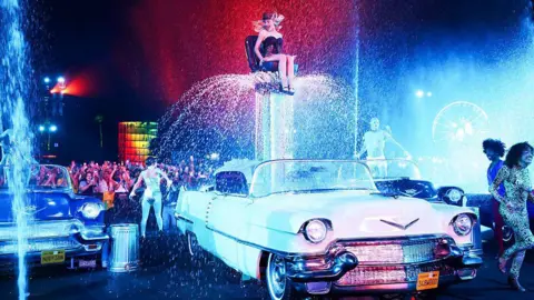 With matching blonde hair and lace corsets, the pair sang the 1990 house hit, before strutting across the stage to perform a new song.