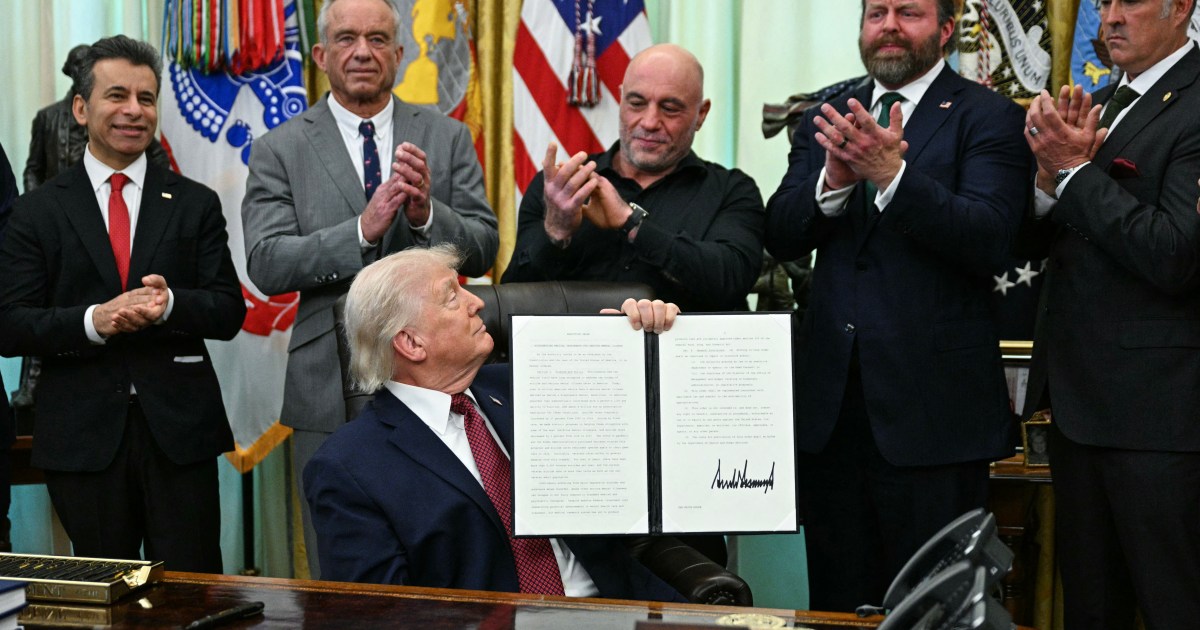The order calls on the federal government to relax restrictions on psychedelics, including ibogaine, for potential treatments. Save Share United States President Donald Trump has signed an executive order to speed up the review of a handful of psychedelic drugs, including the controversial ibogaine. Trump was joined by podcaster Joe Rogan during Saturday’s Oval Office event. Rogan, considered one of the most influential podcasters in the country, has been a leading proponent of ibogaine, which is derived from a plant that grows in West Africa and has been embraced by some military veteran groups as a treatment for post-traumatic stress. Speaking at the event, Rogan recounted how he had previously texted information to Trump about ibogaine. He recalled that the president quickly texted back: “Sounds great. Do you want FDA [Food and Drug Administration] approval? Let’s do it.” Advocacy groups have long pushed for more research into the possible use of psychedelics to treat an array of issues, including depression. “Today’s order will ensure that people suffering from debilitating symptoms might finally have a chance to reclaim their lives and lead a happier life,” Trump said at the signing. “If these turn out to be as good as people are saying, it’s going to have a tremendous impact.” At one point, the president quipped that he would be open to taking psychedelics himself: “Can I have some, please? I’ll take some.” But he quickly pivoted away from the joke. “I don’t have time to be depressed. You know, if you stay busy enough, maybe that works, too. That’s what I do,” he said. Increasing research into psychedelics has proven a rare issue with bipartisan support in the US, where ibogaine and other psychedelics remain banned under the federal government’s most restrictive category for illegal drugs. Health Secretary Robert F Kennedy Jr had previously pledged to ease access to psychedelics for medical use. Trump’s executive order calls on the Department of Health and Human Services to direct at least $50m to states that have enacted or are developing programmes to advance psychedelic drugs for serious mental illness. It also arrives ahead of several actions from the FDA to loosen restrictions. This week, the agency will issue so-called “national priority” vouchers for three psychedelics, which the agency’s commissioner, Marty Makary, said will allow certain drugs to be approved quickly “if they are in line with our national priorities”. The FDA is also taking steps to clear the way for the first-ever human trials of ibogaine in the US. Previous research had been stalled by concerns over the drug potentially triggering fatal heart problems. Ibogaine was first used by members of the Bwiti religion in African nations like Gabon for religious ceremonies. Rogan’s endorsement helped boost Trump ahead of the 2024 presidential election. He has since publicly questioned the administration’s war with Iran, saying it runs counter to Trump’s campaign pledges. Also present on Saturday was Marcus Luttrell, a former Navy SEAL whose memoir about his time in Afghanistan, Lone Survivor, was later made into a film. He praised ibogaine during the ceremony: “It absolutely changed my life for the better.”
