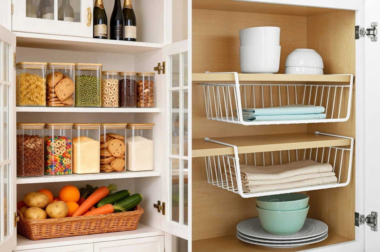 We hope you love our recommendations! While every product is independently chosen by our editors, BuzzFeed and our publishing partners may collect a share of sales or other compensation from the links on this page. You can read more about how our affiliate partnerships work in our Editorial Standards & Ethics Guide. Consider these fridge bins and stacking drawers to be your one-way ticket. Promising review: "Perfect size; versatile to use in a home office, kitchen, or anywhere you need storage." —Maxzee Promising review: "These are just great! I bought one about three weeks ago and just love it for crackers, so I've decided to buy a couple of sets so I can use them for other things. They are great for crackers, cookies, pasta, etc. Highly recommended! They really helped to keep you organized! And our air is tight!" —Mich BuzzFeed Contributing Writer Courtney Hayes has these bins and said: "I just started using these and WOW, what a game changer. I'm able to see all my groceries, so I actually use everything (including that bag of spinach) before it goes bad." Promising review: "If you're finding stuff lost in the back of your fridge and getting annoyed with how much money you're throwing away because of this, then you need this set! I'm in love with the organization of my fridge now!" —tim100574 Promising review: "This was purchased as a housewarming gift. My daughter picked it out because of its ability to expand. This product is highly recommended." —Anonymous Promising review: "I absolutely love the little trays. I can have everything set up, ready to cut, and the tray is right there. My biggest complaint( which isn't a problem really) is that it doesn't fit in the dishwasher very well. Everything else about this cutting board is great, though." —Jess Promising review: "Love it! It fits nicely in my fridge and doesn't need a lot of space. It saves me from carrying heavy cases of water up to the second floor." —LadyTee60 Promising review: "Five stars for this product. Easy installation. Water hoses fit perfectly and don't have those plastic hoses that most filter comes with, also is not an expensive filter but adds protection, even when the city brakes a pipe, you still have tap filtered water. I will recommend 100%" —Jesus Price: $22.85+ (available in two colors) Promising review: "Just as pictured. Great organizer. Easy to put together." —Evita Promising review: "Nice little item, snaps right together with no tools. It doesn't fit my big boxes of storage bags, but that's on me, no flaw in the product." —Walmart customer Promising review: "Gave it as a gift to my granddaughter in her new apartment. She said it was a perfect size and great to have on her counter, also a cabinet space saver. Spices were fresh and she loved that she had refills on the spices for five years." —Elizabeth Promising review: “Flexibility is key! This is the second Better Homes and Gardens spice rack I've bought. Five stars for both price and flexibility. I have weird corner cabinets, and the adjustable feature allows me to use as little or as much space as I need. The only con to these is the lack of a restraining bar. Spice jars do slip off once in a while, but I've never broken one from it.” —Claudia Promising review: “These are so handy. They fit perfectly in my laundry room shelves and effectively double my storage. They are an attractive, clean looking white coated wire. Very study and hold all kinds of things. I put a heavy liner in the bottom of one to hold small items in.” —Pamela Promising review: “King of all door racks! What a relief to get your stuff off the floor or out of the overstuffed cabinet and into an easily accessible location. It's easy enough to put together and hang over the door. These have now organized our spices, canned goods, food storage containers, first aid kit, vitamins, cleaning supplies, flip flops, scarves, gloves, hats, hair products, pet supplies, crafting supplies, paints, and more. Buy one, and you will keep coming back for more.” —Leeza The organizer has space for five pot lids, cutting boards, baking sheets, or whatever else you choose to put in it. Promising review: “Perfect! Nice and sturdy, it fit perfectly in my cabinet and holds all the lids to my Pink Diamond pots and pans set, so I'm happy. Cooking is a little easier now thanks to this little contraption.” —Riva Price: $13.46+ (available individually or in a set of a two) The set includes a 3-inch paring knife, a 5-inch utility knife, a 5-inch chef knife, a 5-inch santoku knife, all-purpose scissors, and a natural wood storage block. Promising review: “Very nice small knife set. I don't like the bigger ones that take up a lot of space.” —Amber Promising review: "We love our new SimpleHuman! It just couldn't be simpler. Lots more capacity than our old one, which we still use in another room, but now we have to stop throwing the junk on the old can when the lid is closed!" —WalmartCustomer Promising review: “Top notch and durable. Excellent quality, fair price. Doubled the space in my bathroom cabinet! Extra bonus… no assembly needed!! Brought it home, placed it in the cabinet, filled the slide-out drawer. Placed a clear tote on the top ‘shelf.’ Now it's so easy to see my stored items, and it looks neat and tidy. It transformed my space!” —rebecca Price: $20.97+ (available in two sizes, two colors, and individually or in a two-pack) This immersion blender has a 2.5-cup chopper, a stainless-steel whisk attachment, and a 24-ounce measuring cup. Promising review: “This tool is amazing. It can replace quite a few of your other kitchen gadgets. I was surprised at the power of this small beast. It did a great job and made the job safe and easy.” —MomandTeacher Price: $29.96+ (available in seven colors) Promising review: "Cleaned out and reorganized the kitchen and these were so great for the drawers and pantry items. Love the variety of sizes and tha