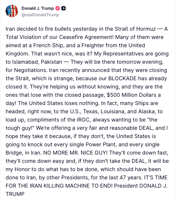 ISLAMABAD (AP) — Pakistan moved ahead Monday with preparations for a new round of talks between the United States and Iran days before a tenuous ceasefire is set to expire, even as renewed conflict around the Strait of Hormuz raised questions about whether the meeting would take place. Over the weekend, the U.S. attacked and seized an Iranian-flagged cargo vessel that it said had tried to evade its blockade of Iranian ports. Iran’s joint military command vowed to respond, and its Foreign Minister Abbas Aragchi told his Pakistani counterpart that American threats to Iranian ships and ports were “clear signs” of Washington’s disingenuousness ahead of the planned talks, Iran state media reported. With tensions flaring and the ceasefire due to expire midweek, Pakistan has intensified diplomatic contacts with both Washington and Tehran over the past 24 hours with the goal of resuming the talks on Tuesday as planned, according to two Pakistani officials involved in the preparations. They spoke on condition of anonymity because they were not authorized to speak to the press. U.S. President Donald Trump has said American negotiators would head to the Pakistani capital on Monday, but it was not immediately clear whether those plans would now change. Iran’s Foreign Ministry spokesperson Esmail Baghaei told reporters in Tehran on Monday that there were no plans yet to attend the talks with the U.S. But at the same time, he did not rule it out. “We have no plans for the next round of negotiations and no decision has been made in this regard,” Baghaei said. Iran on Saturday said it had received new proposals from the United States but suggested a wide gap remained between the sides. It was unclear whether either side had shifted stances on issues that derailed the last round of negotiations, including Iran’s nuclear enrichment program, its regional proxies and the Strait of Hormuz. Iran throttled traffic through the Strait of Hormuz, which connects the Persian Gulf to the open seas, shortly after the U.S. and Israel attacked Iran on Feb. 28 to start the war. The U.S. has also instituted a blockade of Iranian ports. Roughly one-fifth of the world’s oil trade normally passes through the strait, along with critical supplies of fertilizer for the world’s farmers, natural gas and humanitarian supplies for places in dire need like Afghanistan and Sudan. Since the war started, at least 3,375 people have been killed in Iran, according to a new toll released Monday in official Iranian media by Abbas Masjedi, the head of Iran’s Legal Medicine Organization. He did not break down casualties among civilians and security forces, instead just saying that 2,875 were male and 496 were female. Masjedi said 383 of the dead were children 18 years old and under. More than 2,290 people have also been killed in Lebanon, 23 in Israel and more than a dozen in Gulf Arab states. Fifteen Israeli soldiers in Lebanon and 13 U.S. service members throughout the region have been killed. Iran’s grip on the Strait of Hormuz has also sent oil prices skyrocketing and given rise to one of the worst global energy crises in decades. Oil prices recovered slightly following Iran’s announcement that the strait was being reopened a 10-day truce between Israel and the Iranian-backed Hezbollah militant group in Lebanon took hold on Friday. But then Trump said the U.S. blockade “will remain in full force” until Tehran reaches a deal with the U.S. and on Sunday the military seized the Iranian cargo ship, the first interception since the blockade began last week. Iran’s joint military command called the armed boarding an act of piracy and a ceasefire violation, the state broadcaster said, and vowed to again enforce restrictions imposed early in the war. Already on Saturday, Iran fired at ships trying to transit. Oil prices were up again in early trading on Monday, with Brent crude, the international standard, at about $95 a barrel — up more than 30% from the day the war started. Iran early Monday warned it could keep up the global economic pain as ships remained unable to transit the strait, with hundreds of vessels waiting at each end for clearance. Security of the strait is not free and “the choice is clear: either a free oil market for all, or the risk of significant costs for everyone,” Mohammad Reza Aref, first vice president of Iran, said in a social media post calling for a lasting end to military and economic pressure on Tehran. ___ Gambrell reported from Dubai, United Arab Emirates, and Rising from Bangkok. By entering your email and clicking Sign Up, you're agreeing to let us send you customized marketing messages about us and our advertising partners. You are also agreeing to our Terms of Service and Privacy Policy.