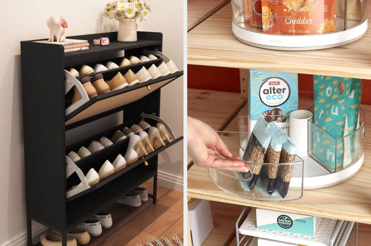 We hope you love our recommendations! While every product is independently chosen by our editors, BuzzFeed and our publishing partners may collect a share of sales or other compensation from the links on this page. You can read more about how our affiliate partnerships work in our Editorial Standards & Ethics Guide. Prepare for every aspect of your life to be *very* pristine. The set comes with one six-cell bin (for scarves and ties), an eight-cell bin (for underwear, briefs, and ties), a seven-cell bin for bras, and a 24-cell bin for socks. Promising review: "No matter how neatly I fold my bras and underwear, they always seem to become a big jumble in the drawer. These organizers are perfect for keeping everything in place, and you won't forget about those items you own that end up buried at the back." —M. Hanson Get a set of four from Amazon for $15.16+ (available in seven colors and as a set of seven). Some reviewers use it to organize their bathroom products too! Promising review: "This thing is [well made], it's easy to put together, and I love it! It cleared so much room in my kitchen pantry and makes it so much easier to organize! LOVE IT! Definitely worth the $$$." —David A. Payne Get it from Amazon for $26.98+ (available in five sizes and in white or black). Promising review: "I am so happy I found this little gem of a product. I got one for myself and one for a friend who I was helping get organized. The little pockets are great and hold more than you think they will. I love that the front of the pockets is a clear view, so you can see everything that is in the pocket. The product is very sturdy and really super easy to put together and hang up on the doors." —MM1986 Get the six-shelf version from Amazon for $19.97 (available in seven colors and a four-shelf version). These dividers are designed to fit on shelves up to 7/8" thick. Promising review: "I love these! They fit snugly over my shelf, so they don't shift or move around. I have a lot of handbags, and it's been a mess on my closet shelf for the ones that are floppy. I have limited closet space in a small home, so my choices of where/how to store them are limited. This was the perfect solution. I plan on buying more when I get around to re-arranging sweaters on shelves." —BarbraGenie Get a set of two from Amazon for $17.99. YouCopia is a woman-owned small biz that makes ingenious home and kitchen storage solutions. Promising review: "These are a dream come true. So many of these other lazy Susans are just lazy. This one takes it up ten notches. It's the valedictorian of Susans. This one spins with ease, is so simple to clean, looks great, AND has removable sections. WHAT. Those other ones just don't have that forward thinking. I've bought these for home — my spices, my snacks, my makeup. I even bought these for my work and blew people's mind. They had no idea that we could save so much space in our cabinets. They loved them." —Jg Get it from Amazon for $20.90+ (available with three or six compartments and in another style). Promising review: "These are actually cuter than I expected! They are a tad smaller than some I've seen, but they actually looked great and can hold plenty of Q-tips and cotton balls in the spare bathrooms. I have mine on a serving tray with a candle and vase, and they look great without taking up too much space!" —tara savage Get a set of four jars from Amazon for $9.99 (also available in sets of two or three). And grab that sleek cable sleeve (aka a wire cover) while you're at it! Promising reviews: "I've been searching for something to not only hide the cord mess but protect them from my munch monster of a cat. This box in addition to cable straps and cable wrap has solved my cable management like magic! I highly recommend this product." —Lauryn "Seriously where has this been all my life??? Highly recommend. Excellent cord management soulmate (I meant to type solution and it autocorrected to soulmate, however I think that’s accurate LOL.) Just get it. Won’t regret." —April Olsen Get it from Amazon for $22.99+ (available in two sizes and three colors). No tools required! It comes with a two-way clamping design that works on both horizontal and vertical surfaces. It's compatible with desks that are up to 3.1 inches thick. BedShelfie is a POC-owned small business that focuses on space-saving solutions for the home. Promising review: "First impression of the CarryUp, the build of it is solid and felt heavy. The weight of it made me confident it will hold up well and last me a long time. Overall setup was a breeze. No tools needed at all. One sentence that sums up this product for me ... Simple and effective!!!!! If you have messy cords underneath your desk then don't think, just buy this product." —Eddie Sadiwa Get it from Amazon for $12.99 (available in dark gray or cream). Promising review: "What an awesome organizer set. I used half of the containers from the set to organize a drawer. There is enough to organize two drawers. I am very impressed with the results. Non-slip feet are a great thoughtful feature. If you are still thinking, buy it!" —A. Syn Get the 25-piece set from Amazon for $16.14+ (available in 10 colors). It comes with two wide bins, two narrow bins, one can dispenser that can hold 10 standard 12-ounce cans or juice boxes, and one egg bin with a stackable lid that can hold 14 eggs. Promising review: "It's nice to be able to find things in the refrigerator and be able to pull out the whole tray container to see what's in the back of the fridge. I don't know if this happens to you, but I find my way to the back every so often, and come to find out a jar in the back expired a year ago. Now I can see everything and use it." —BookBroke Get a six-piece set from Amazon for $31.99. Bonus: this also stops the inside liner of your purse from getting dirty if anything happens to explode. Promising review: "My summer handbag has no dividers, so everything falls into a l