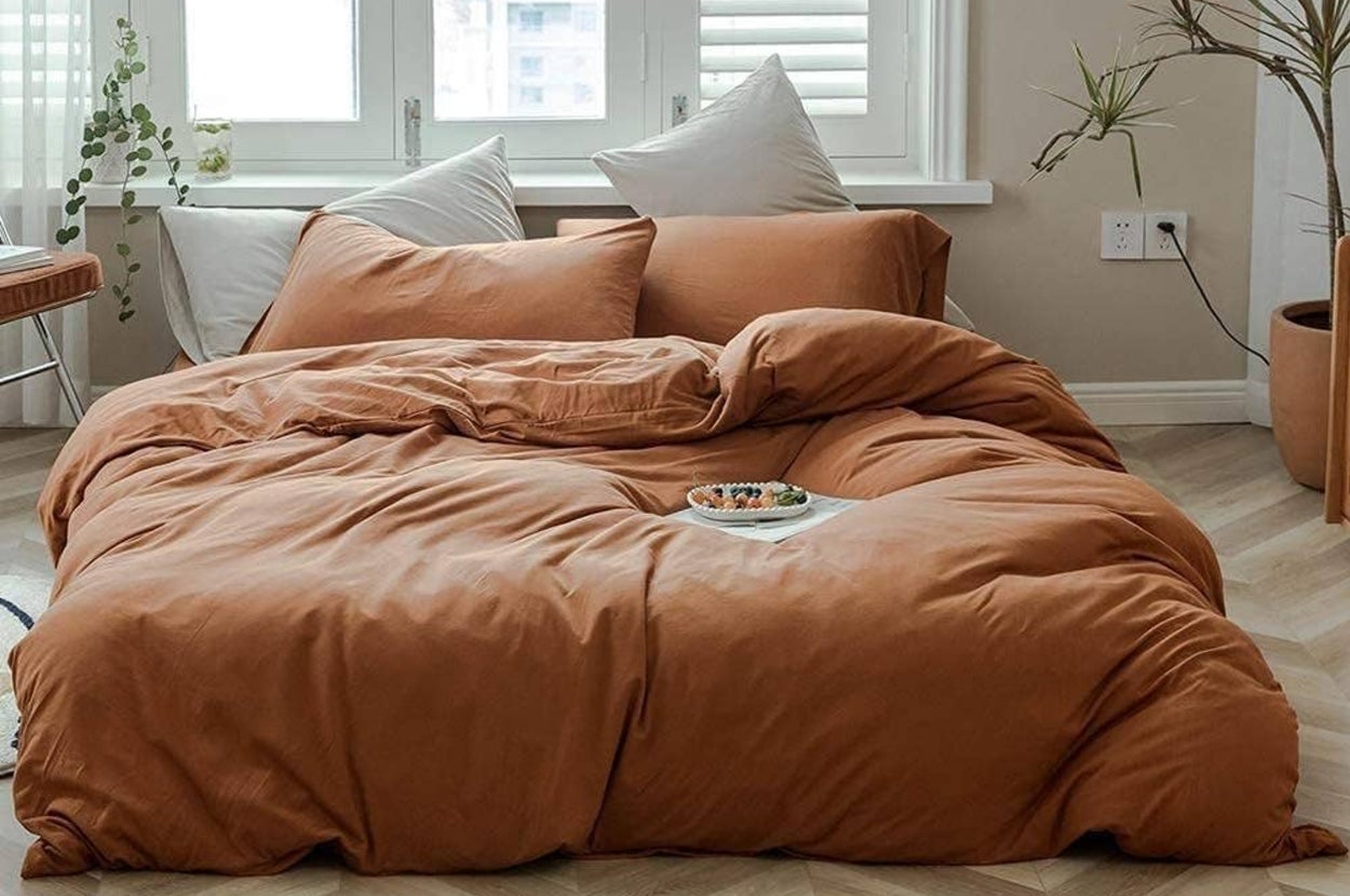 Promising review: "It works awesome, the corner ties save me from having to adjust it every morning. It’s soft and cozy. I tried this duvet cover with a single duvet insert and with two duvet inserts (if you want your bed to feel like a hotel bed, that is the move), and either way very cozy." —Rhiannon M.