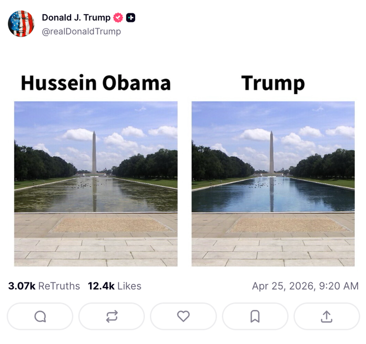 President Donald Trump gave his Truth Social followers a glimpse into the possible future of the Lincoln Memorial Reflecting Pool in DC, but he couldn’t seem to do it without mentioning former President Barack Obama. At 9:20 a.m. Saturday, Trump posted two images of the reflecting pool side by side. The first image shows the pool with dull-colored water covered in algae. That image is labeled “Hussein Obama,” a nod to the former president’s middle name, often invoked by his opponents to suggest, falsely, that he is a Muslim. The second image is identical (note the position of the clouds in the sky and ducks on the water), except the water color has been altered to a more vibrant blue and no algae is visible. That image is labeled “Trump.” Trump announced Thursday that he was having the reflecting pool renovated, including coating its surface in “American flag blue” and repairing leaks. “I have a guy who’s unbelievable at doing swimming pools up the road,” Trump said, estimating the project would cost $1.5 to $2 million. His Saturday morning post appeared to reference pool renovations undertaken during Obama’s second term, which led to major algae issues at the historic landmark. By entering your email and clicking Sign Up, you're agreeing to let us send you customized marketing messages about us and our advertising partners. You are also agreeing to our Terms of Service and Privacy Policy.