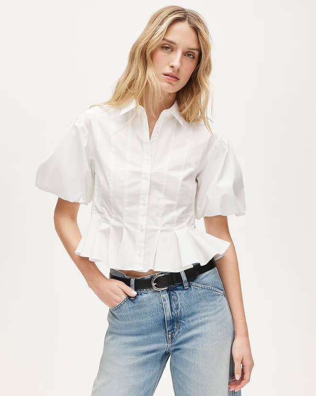 Promising review: "Such an adorable and well-made top — I love its unique style! It runs a bit small, so I sized up. Can't wait to wear it this spring with jeans, pencil skirts, and Bermuda shorts. Endless options with this top!" —OK Susan