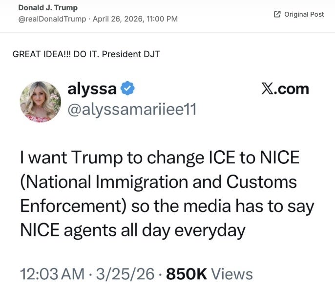Trump is awake and he’s now demanding that ICE be renamed to NICE so the media has to say “NICE agents” everyday. This is what the president is focused on. Very weird stuff. pic.twitter.com/5zOuYTMCaA