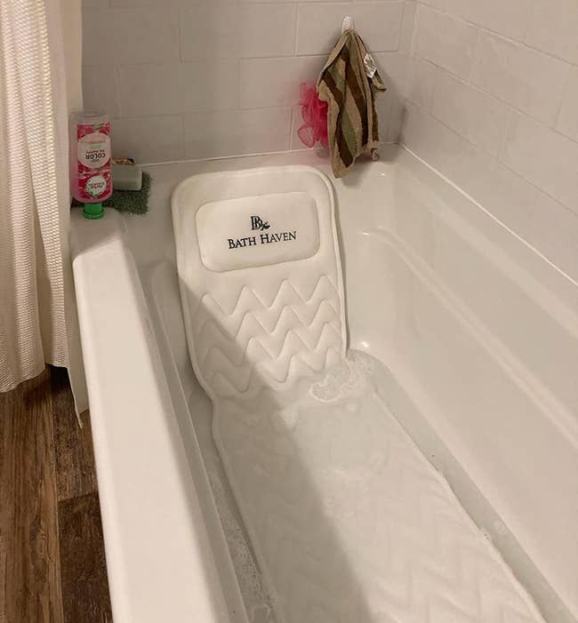 Promising review: "I absolutely love it. My tub is an old-fashioned soaking tub, and it was slippery to stay seated comfortably, and I always ended up on my tailbone — youch. I got this mat so I can sit comfortably and rest my head. OMG, nirvana! I was in the tub for so long relaxing I had to add more hot water. The suction grips stayed put, and the pillow for my head was perfect. Finally, I can sit without sliding around. After the bath, I hang the loop at the top over a plastic hanger and hang it over the tub to dry overnight. In the morning, I roll it up and store it in the towel closet." —Belle Jardiniere
