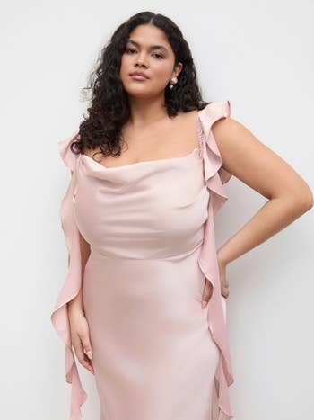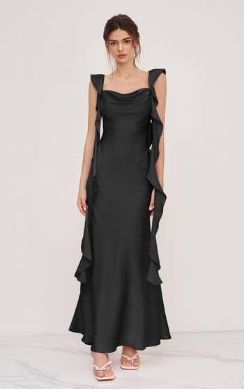 Bring the drama in this satin gown! It has flutter sleeves that turn into ever-flowing ruffles and a hem length that'll reach the ballroom floor. If you're looking for a statement piece, this is the one. But be warned, all statements from other guests will be of the compliment variety.